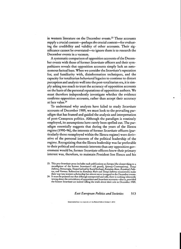 The Uses of Absurdity: The Staged War Theory and the Romanian Revolution of December 1989 (Part II, pp. 511-520, 1999) by Richard Andrew Hall