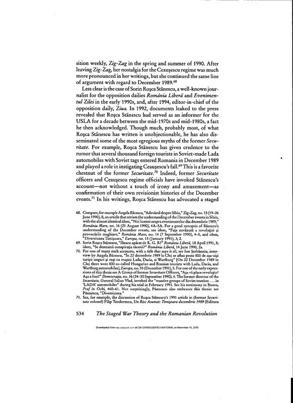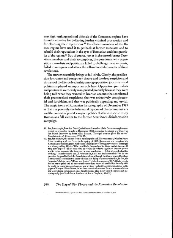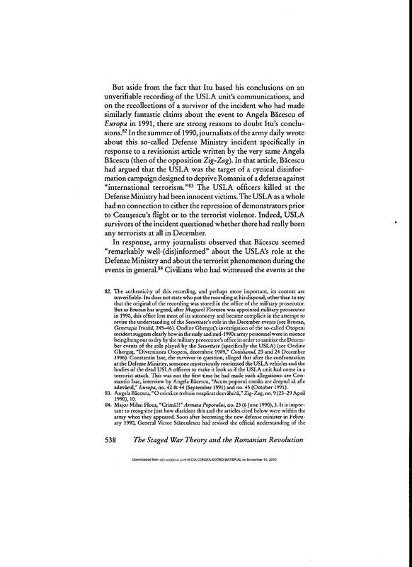 Richard Andrew Hall, “The Uses of Absurdity: The ‘Staged-War’ Theory and the Romanian Revolution of December 1989,” East European Politics and Societies vol 13, no. 3 (Fall 1999) (University of California Berkeley Press).