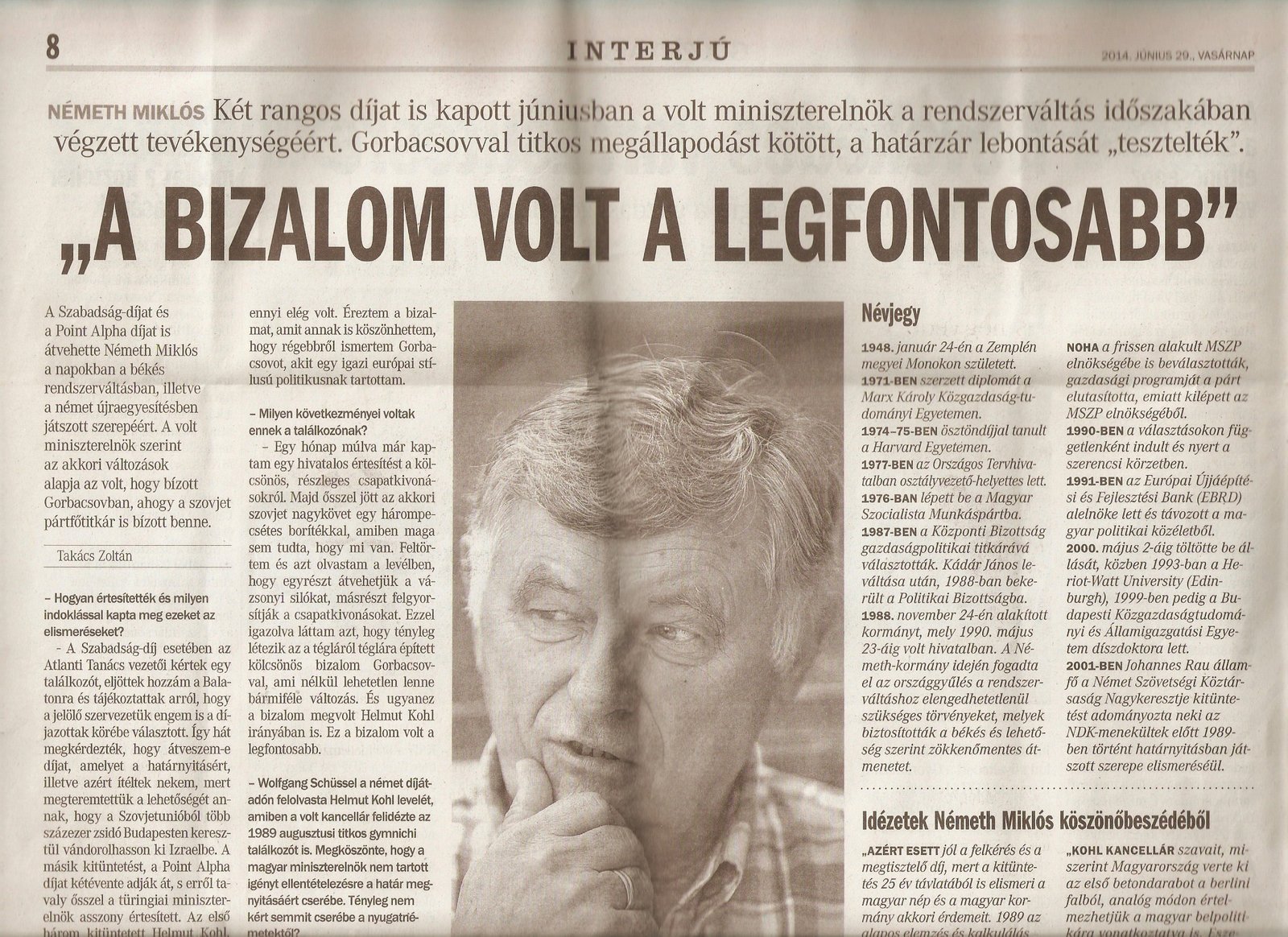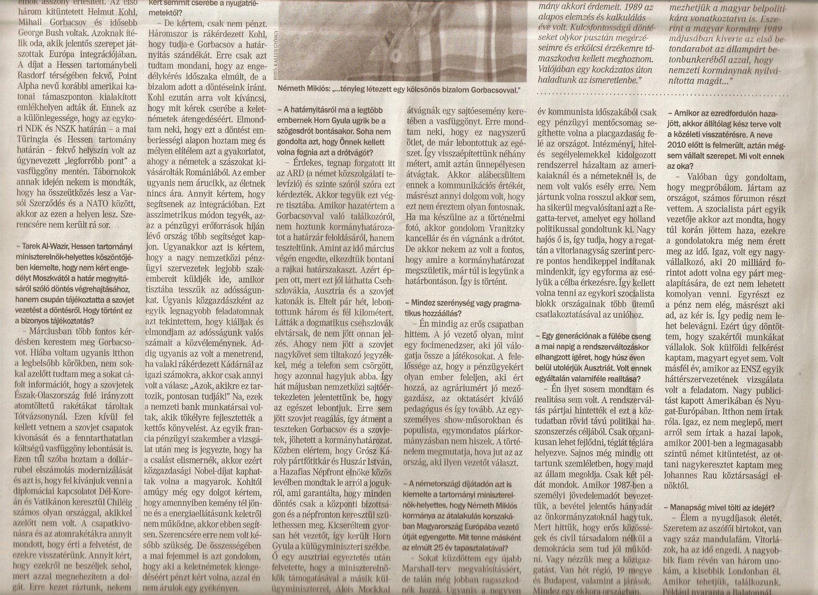 I was reminded of this in late June of this year when I found the following interview in the weekend Hungarian publication Vasarnapi Petofi Nepe. Like Forrest Gump’s proverbial box of chocolates, you never know quite what you are going to get in a weekend publication. In this case, an unexpected find: Miklos Nemeth’s comments about discussions with the West Germans in the lead up to the pan-European picnic.