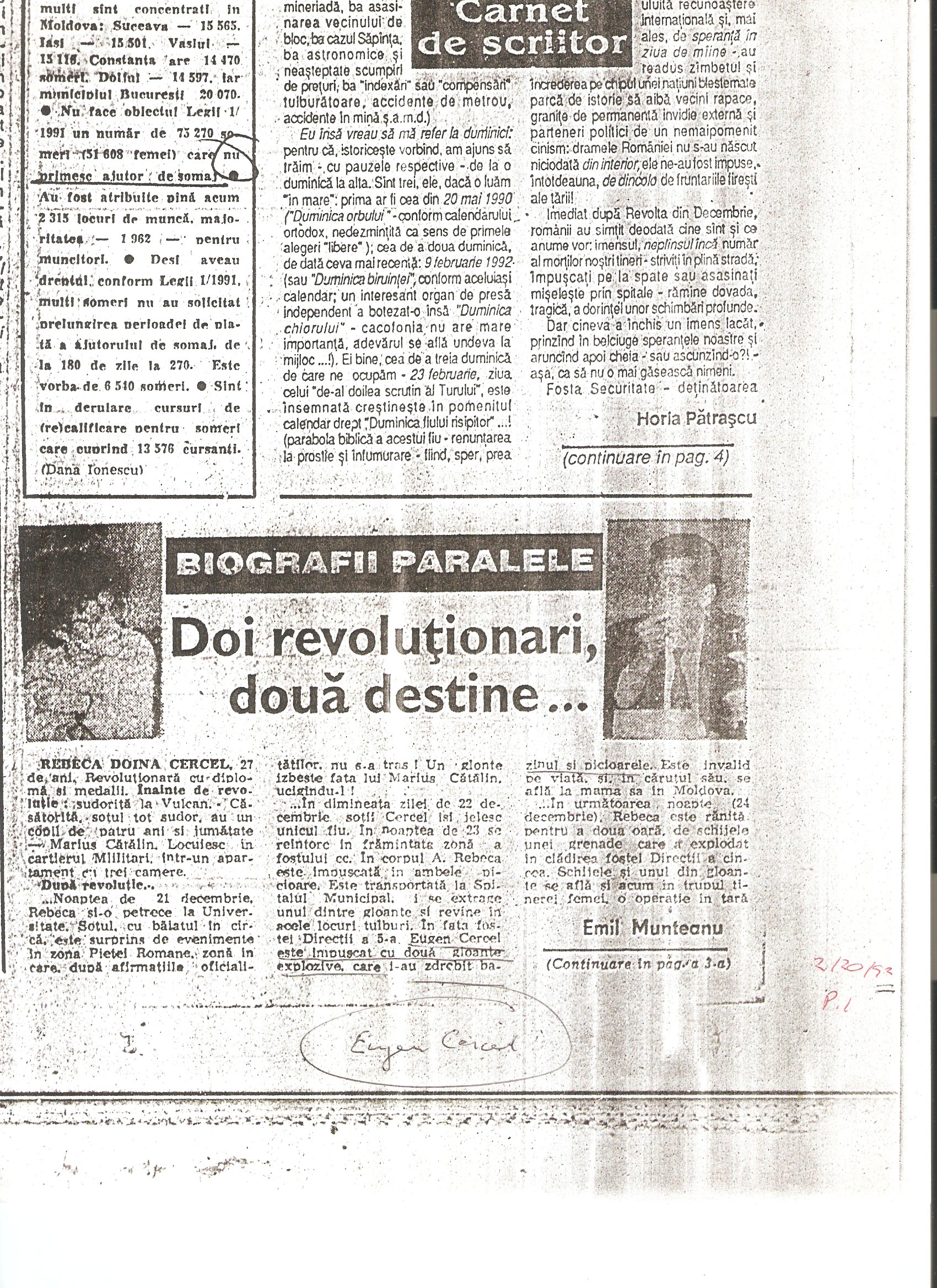 Emil Munteanu, “Doi revolutionari [Rebeca Doina Cercel si Cazimir Benedict Ionescu], doua destine…” Romania Libera, 20 februarie 1992, p. 1.
