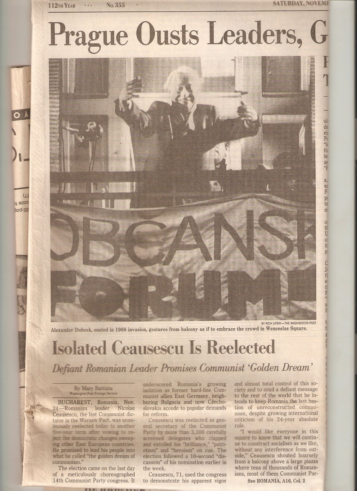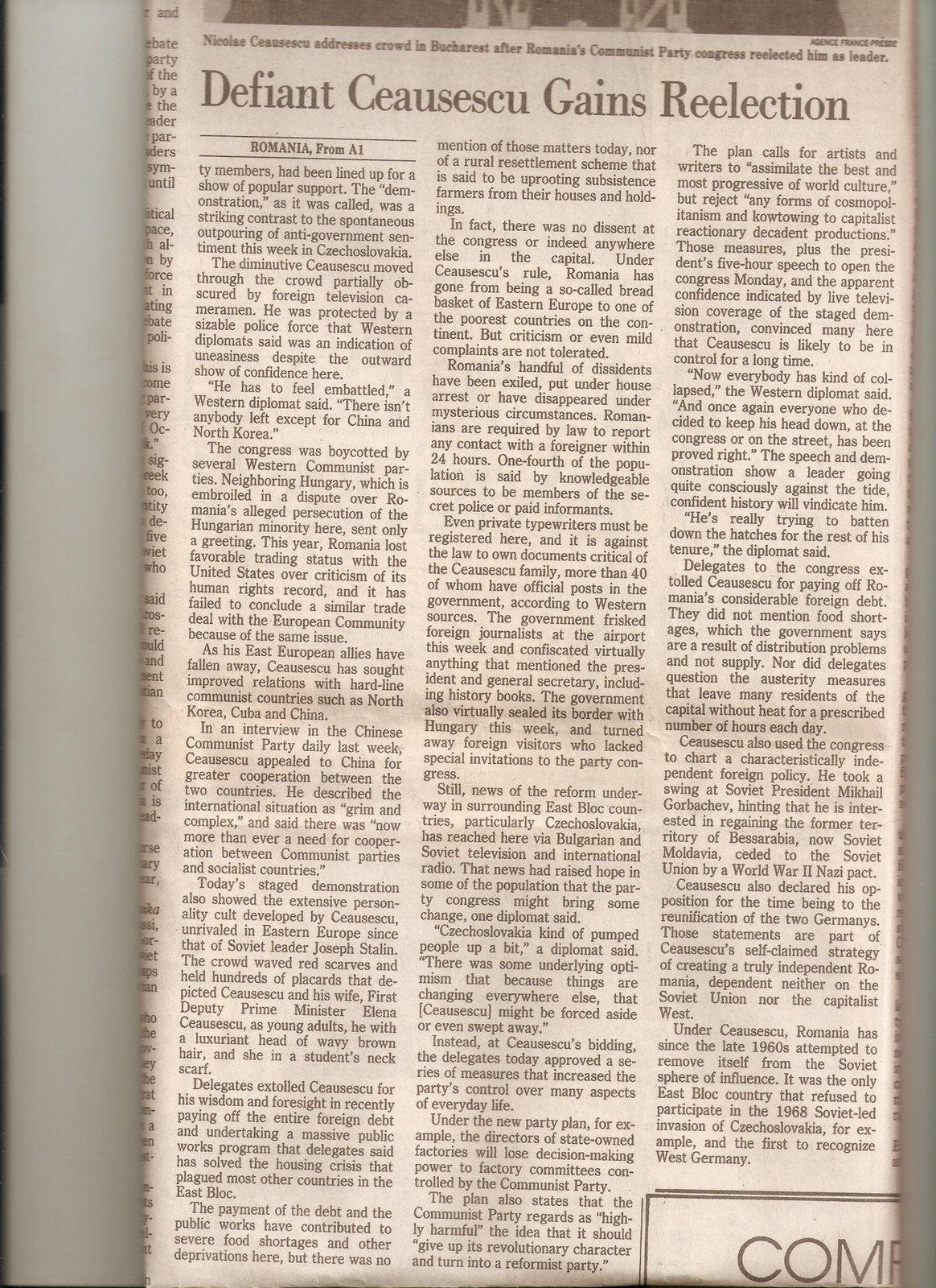 Mary Battiata, “Isoated Ceausescu is Reelected.  Defiant Romanian Leader Promises Communist ‘Golden Dream,” Washington Post, 25 November 1989.