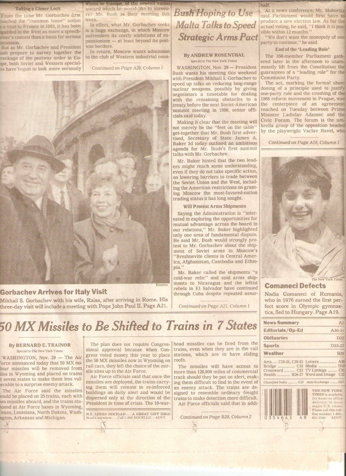 Europa Liberă transmitea, la 3 decembrie 1989, în cadrul buletinului de ştiri de la ora 18:00, ştirea că directorul executiv al federaţiei de gimnastică din Statele Unite ale Americii a declarat că organizaţia sa este gata s-o ajute pe gimnasta Nadia Comăneci să se stabilească la Indianapolis, “unde este centrul federaţiei”.