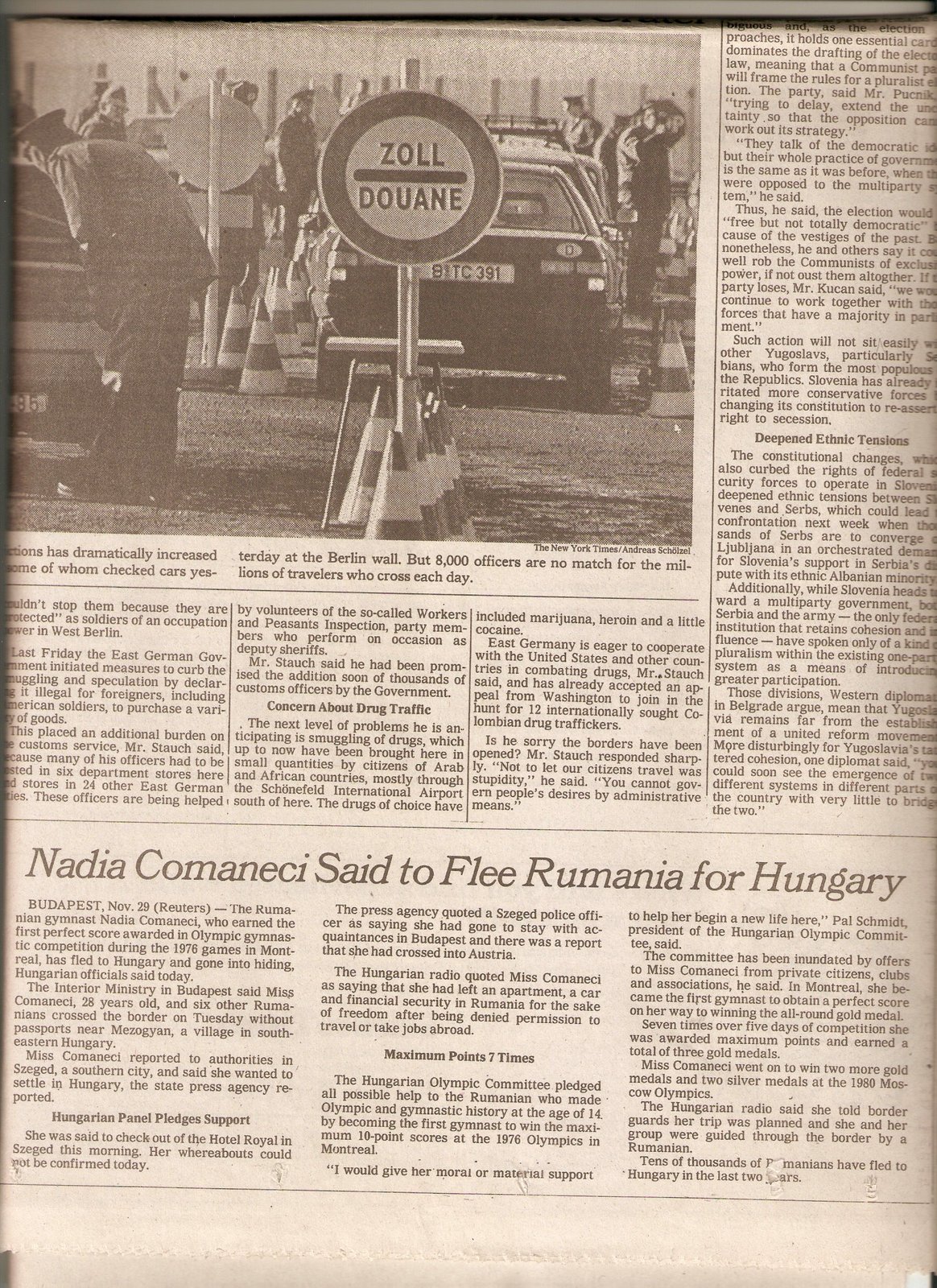 “Lumea liberă s-a îmbogăţit de aseară cu un nume de seamă, cel al Nadiei Comăneci, nume ce va rămâne magic pentru totdeauna în lumea sportului mondial. Mai mult decât o campioană, mai mult decât prima gimnastă a Jocurilor Olimpice din această a doua jumătate a secolului, ea rămâne ca o stea care încă mai face lumea să viseze. Nadia Comăneci a trecut deci în Vest nu pentru că nu locuia bine ori nu avea maşină, căldură sau nu avea ce mânca. Nu! În România Nadia era o privilegiată faţă de restul populaţiei, dar voia libertate. I se interzicea să se ducă până în Ungaria.