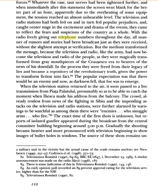 Yes, television and radio gave out phone numbers that contributed to the scope of the confusion, and arguably incentivized the spread of incorrect information. A Western academic audience will love this. See, it was all understandable, without having to go down the rabbit hole of “conspiratorial-thinking”…like so many of those silly Romanians (they don’t say the latter out loud, but it is implied).