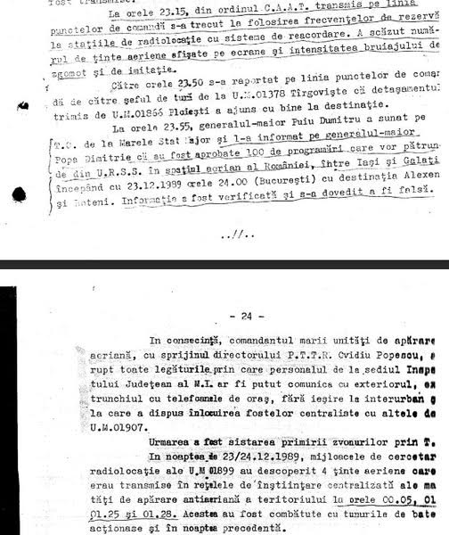 “La orele 23,55, generalul-maior Puiu Dumitru a sunat pe T.O. de la Marele Stat Major si l-a informat pe generalul-maior Popa Dimitrie ca au fos aprobate 100 de programari care vor patrunde din U.R.S.S. in spatiul aerian al Romaniei, intre Iasi si Galati incepand cu 23.12.1989 orele 24,00 (Bucuresti) cu destinatia Alexandria si Boteni. Informatia a fost verificata si s-a dovedit a fi falsa.”