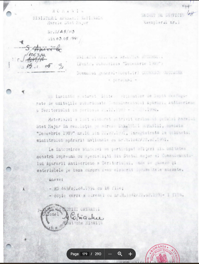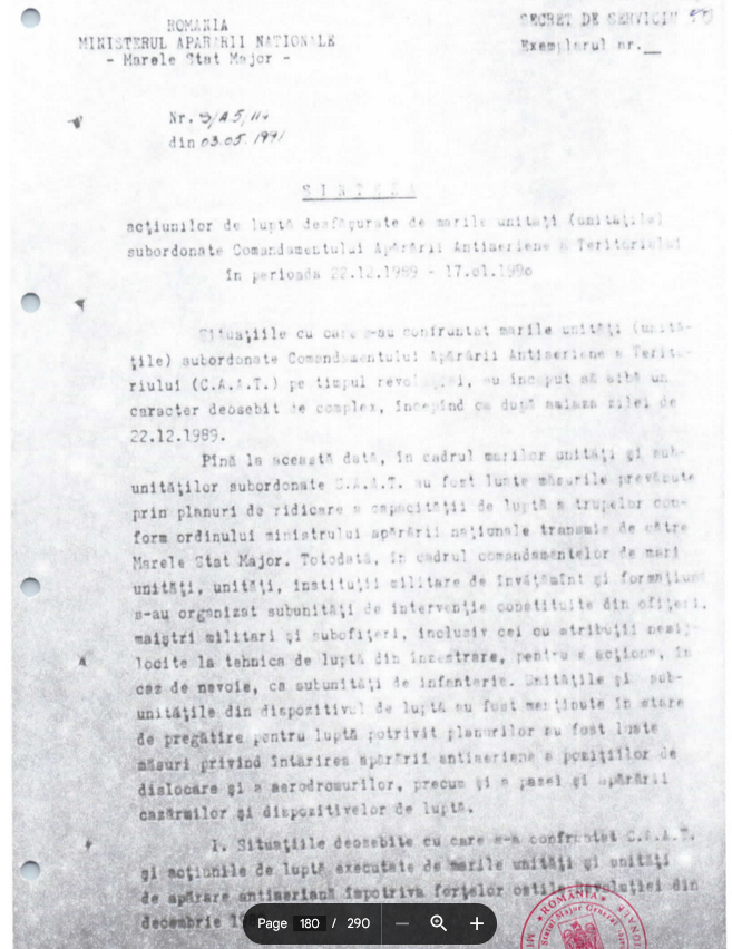 Below the full C.A.A.T. synthesis dated 3 May 1991 for those who can read Romanian (these are the copies as received by Pitu, Cosneanu, and the other military prosecutors; apologize for the quality, but this is how they were sent), with excerpts from the first two pages (p. 180 and p. 181) transcribed courtesy of Costinel Mirea Venus: