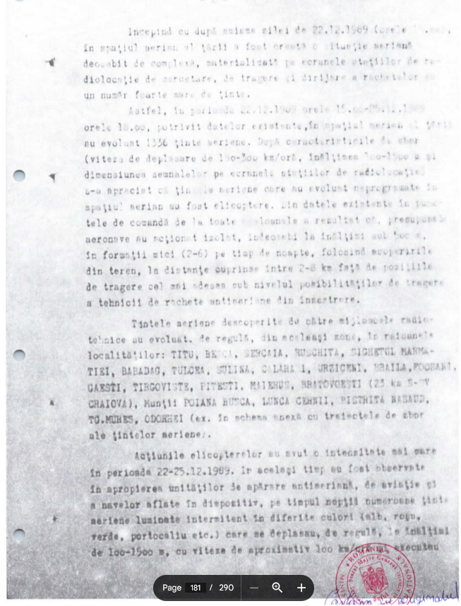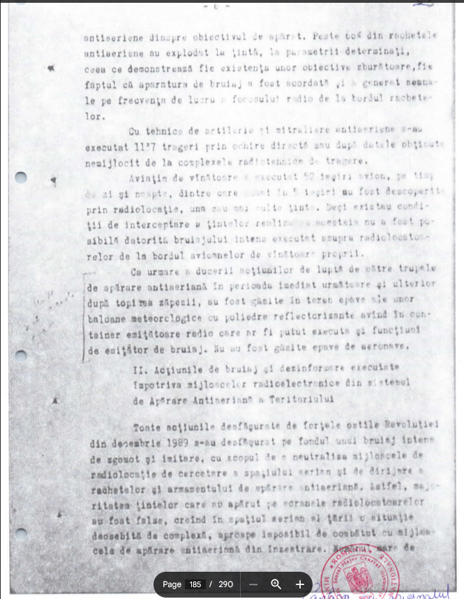 A single excerpt from the Territorial Antiaircraft Defense Command’s (C.A.A.T.) “SYNTHESIS of military operations undertaken by major units (the units) subordinated to the Territorial Antiaircraft Defense Command during the period 22 December 1989 to 17 January 1990” sums up the conclusions (although the document breaks down in much greater details) of this report from spring 1991 (thus over a year after the events themselves) as follows: