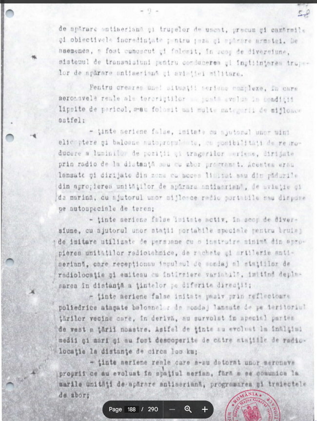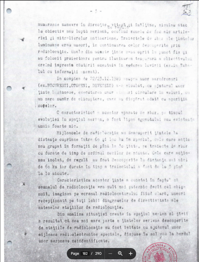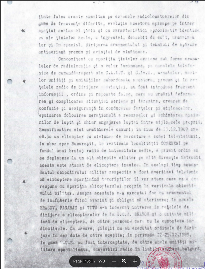 Astfel în perioada 22.12.1989 orele 15.00 – 25.12.1989 orele 18.00, potrivit datelor existente în spațiul aerian al țării au evoluat 1336 ținte aeriene. După caracteristicile de zbor viteza de deplasare de 150 300 km/h înălțimea 100 1500 m și dimensiunea semnalelor pe ecranele stațiilor de radio locație s a apreciat că țintele aeriene care au evoluat neprogramate în spațiu la ea au fost elicoptere din datele existente în punctele de comandă de la toate eșaloanele A rezultat că presupusele aeronave au acționat izolat în deosebi la înălțimi…, în formații mici (2-6) pe timp de noapte, folosind acoperiile din teren, la distanțe cuprinse între 2-8 km față de pozițiile de tragere cel mai adesea sub nivelul posibilităților de tragere a tehnicii de rachete antiaeriene din înzestrare.