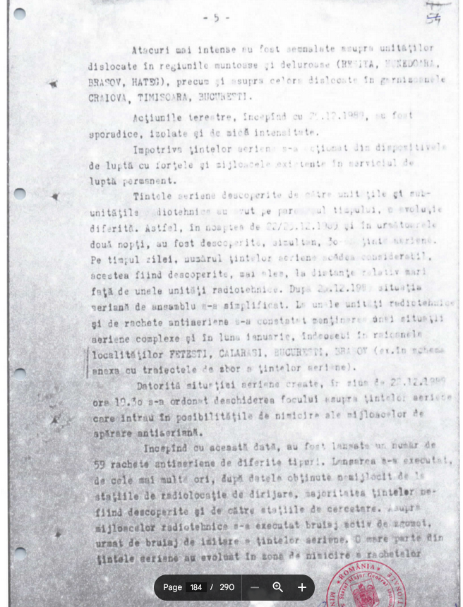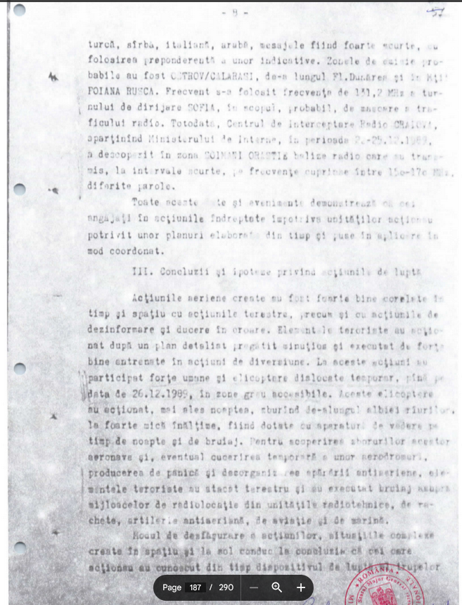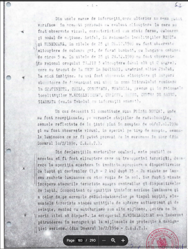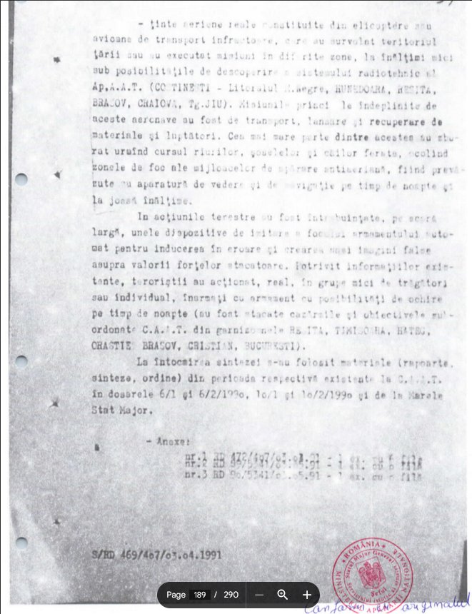 C.A.A.T. (03.05.1991) SINTEZA actiunilor militare desfasurate de marile unitati (unitatile) subordonate Comandantului Apararii Antiaeriene a Teritoriului in perioada 22.12.1989-17.01.1990 v. Military Prosecutor Catalin Ranco Pitu: “Every Army structure after January 1990…concluded that the terrorists did not exist”