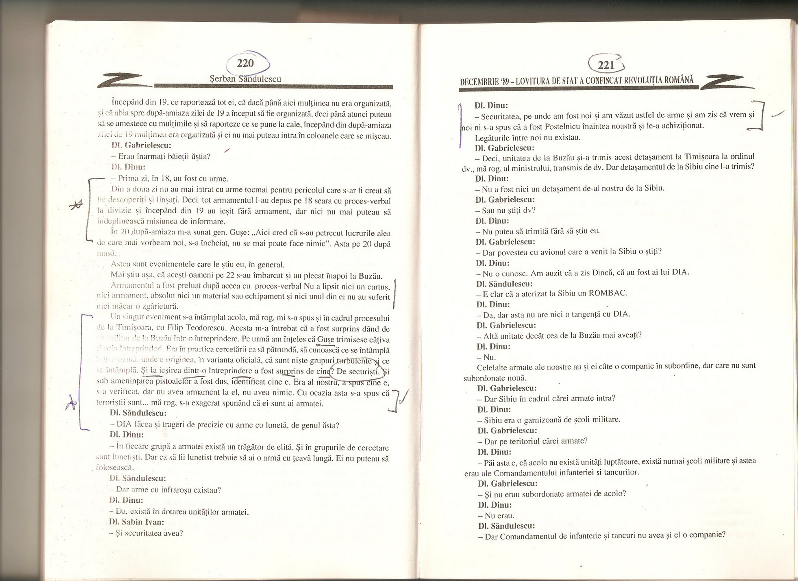 I find it relatively stunning that Watts invokes the reported March 1990 statement by Teodorescu when it has long since been established that the people Teodorescu was referring to were undercover personnel of the Army’s intelligence unit (DIA). I mentioned this as early as 1996, http://atomic-temporary-3899751.wpcomstaging.com/rewriting-the-revolution-1997-chapter-6-18-22-december-1989/ (see text and fn. #11), and it has also been clarified by Marius Mioc (https://mariusmioc.wordpress.com/2009/10/09/rich-hall-brandstatter-11/) and Gino Rado ( http://memorialulrevolutiei.ro/index.php?page=revista-on-line/memorial-7/agentii-straini , see Emil Macri quote). In fact, the head of DIA Stefan Dinu discusses it directly in the Sandulescu volume (p. 220) invoked by Watts (see xerox below). Conveniently, Watts quickly jumps to Teodorescu’s book published later in 1992, for a book-buying audience and when he was out-of-the-woods so-to-speak and with “mainstream opinion” already well-contaminated by public Securitate disinformation over the previous two years. Talk about context important to take into account when evaluating its credibility!