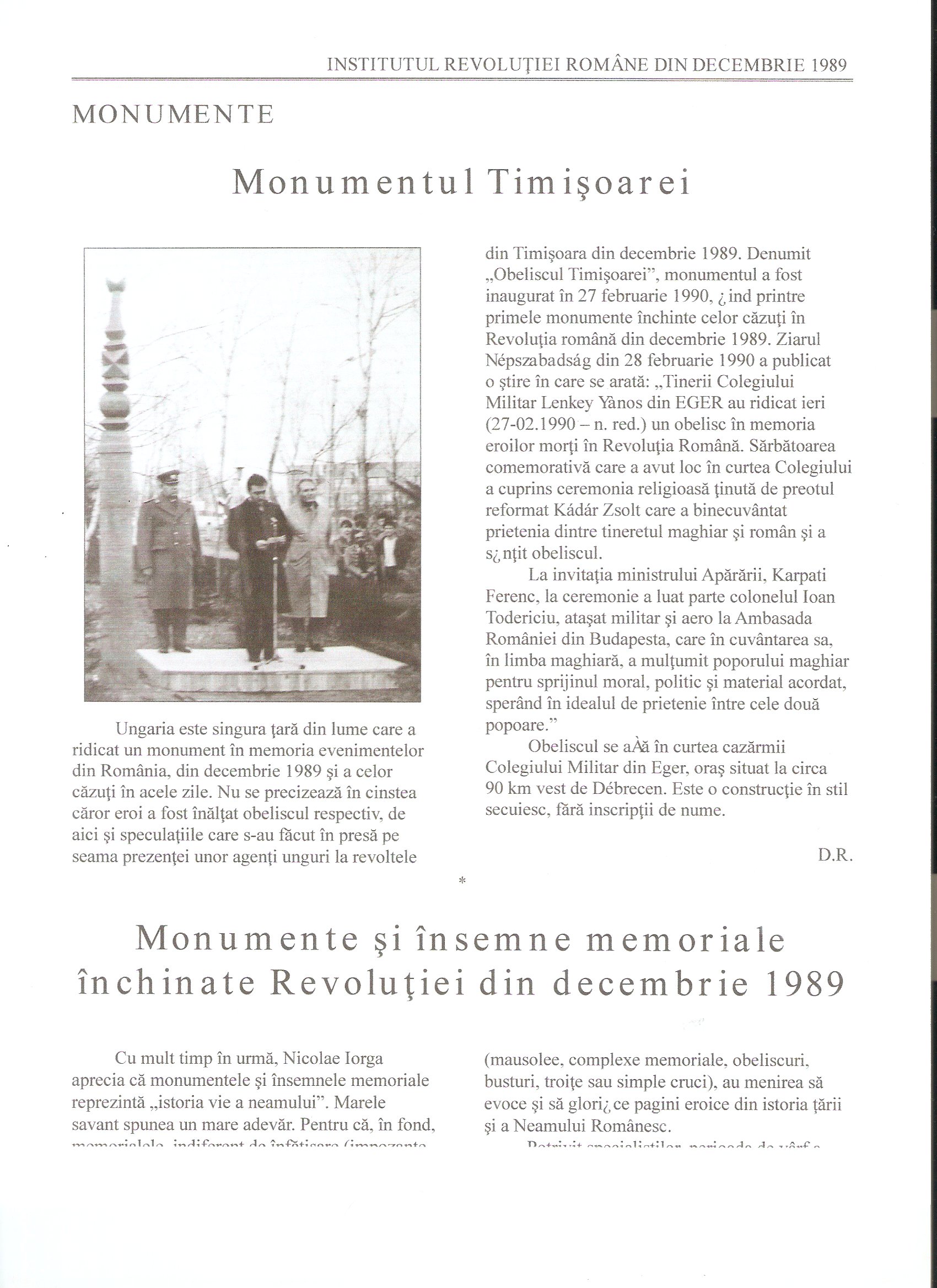Here is information about the monument in question, which is dedicated to the people of Timisoara, from most notably the Romanian Military Attache in Budapest in December 1989, Colonel Ioan Todericiu: