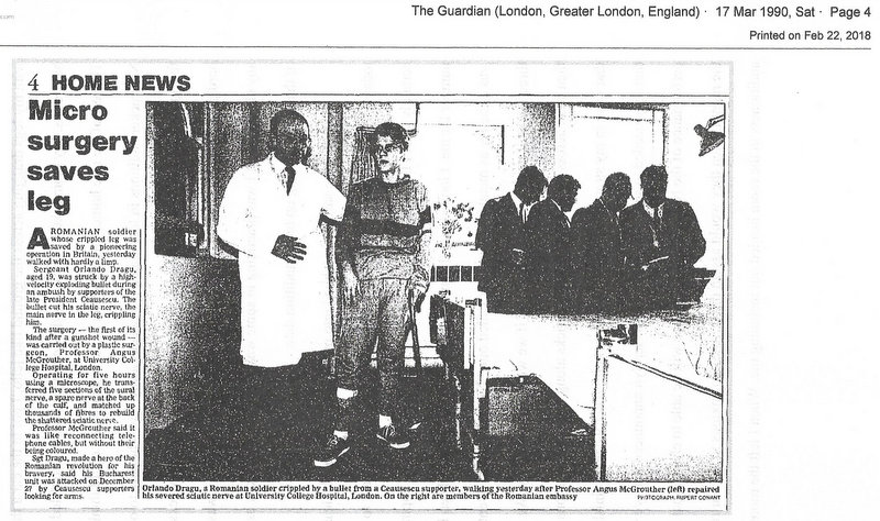 “A Romanian soldier whose crippled leg was saved by a pioneering operation in Britain, yesterday walked with hardly a limp. Sergeant Orlando Draga, aged 19, was struck by a high-velocity exploding bullet during an ambush by supporters of the late President Ceausescu [on 27 December]” The Guardian (and The Times), 17 March 1990