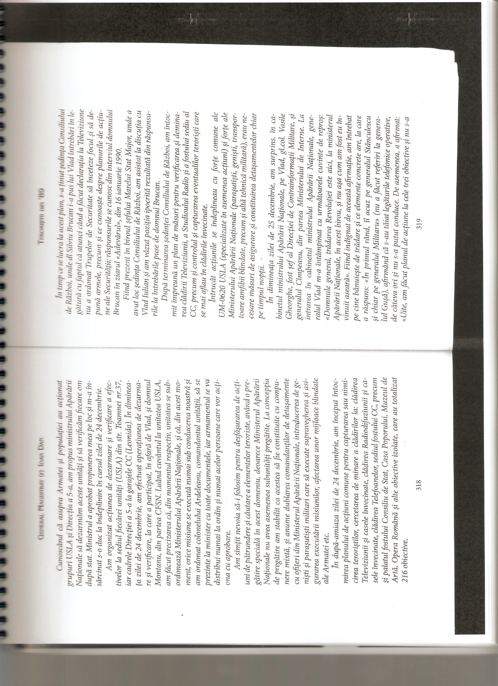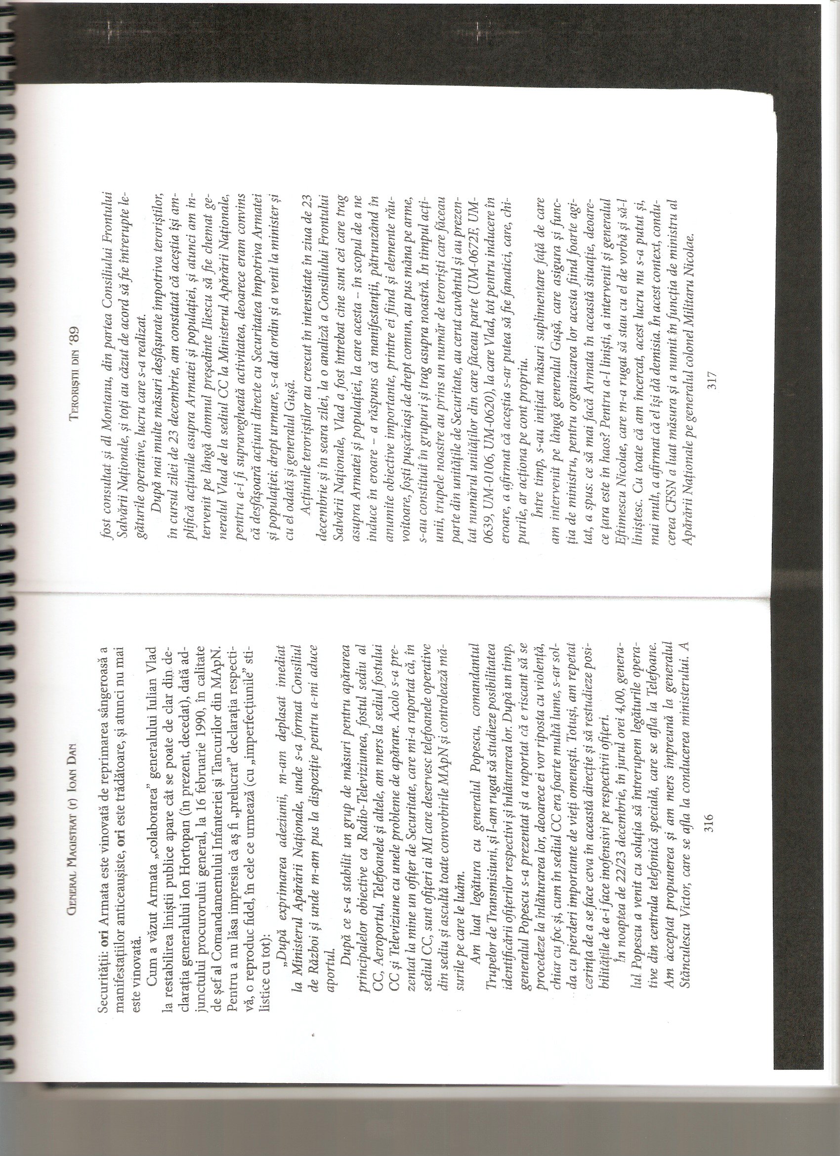 In aprilie 1990, generalul Ghoerghe Diaconescu a fost destituit din functia de conducere in Directia Procuraturilor Militare. La plecare, mi-a predat cheia de la fisteul sau, cu mentiunea ca acolo au mai ramas cateva hartii fara importanta. Intrucat, la data respectiva, ma aflam in cea mai mare parte a timpului, in procesul cercetarilor de la Timisoara, mult mai tarziu, am dorit sa pun in respectivul fiset o serie de acte. Am cercetat ce mai ramasese de pe urma generalului Diaconescu si, spre surprinderea mea, am gasit declaratia olografa a generalului Iulian Vlad, data fostului adjunct al procurorului general, fostul meu sef direct, nimeni altul decat generalul Diaconescu, la 29 ianuarie 1990, cand toate evenimentele din decembrie 1989 erau foarte proaspete. Repet, este vorba despre declaratia olografa, un text scris foarte ingrijit, pe 10 pagini, din care voi reda acum integral doar partea care se refera expres la “actiunile teroriste in Capitala” (formularea apartine generalului Vlad).