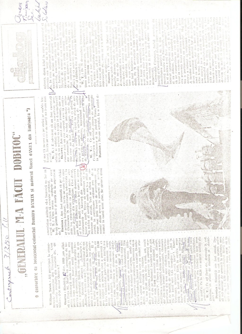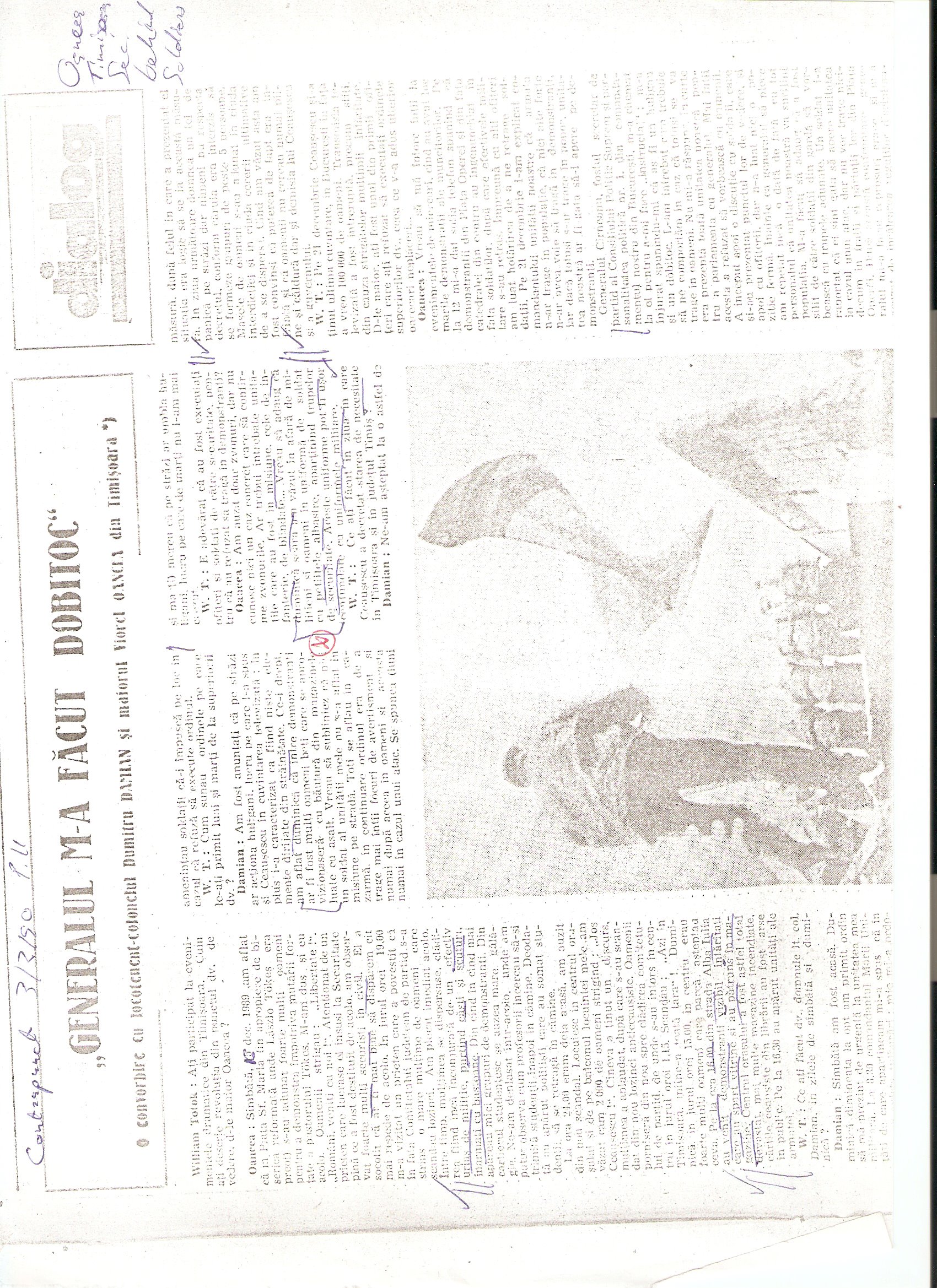 Thanks to the publication of Dosarele Revolutiei de la Timisoara, we can now confirm that was reported in the media in July 2008 is indeed the actual quote of Dumitru Marcu, commander of U.M. 01380 Arad, as recorded in his report dated 4 January 1990. In this report, Marcu spoke of unidentified personnel infiltrated among the personnel of his military unit who used powerful flashlights (lanterns/lamps), and he suggests that these may have been Securitate/Militie personnel.