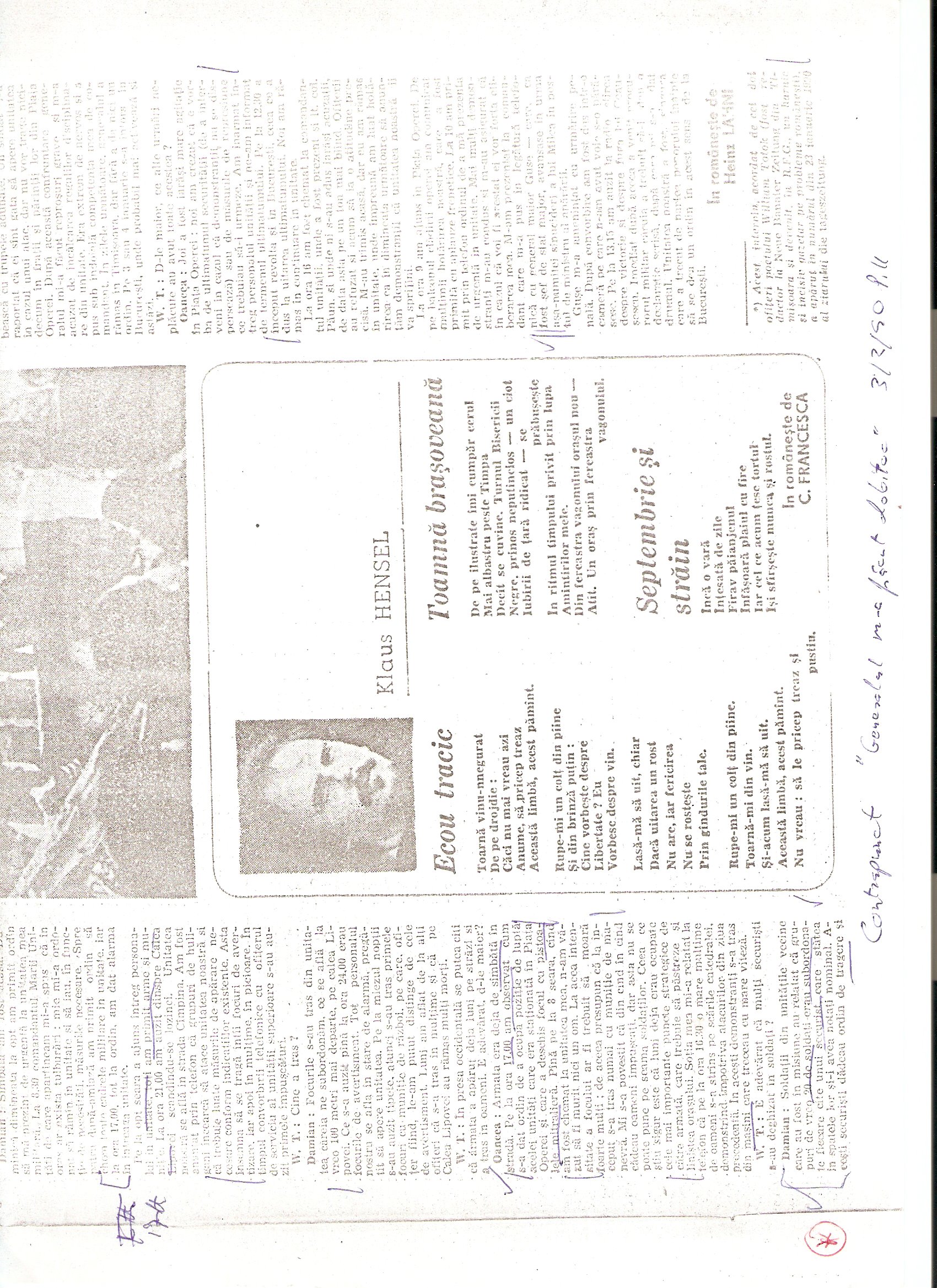 “Între efectivele noastre au fost semnalate efective de militari necunoscuţi care aveau în dotare lanterne foarte puternice şi care îndreptau fascicolul luminos spre balcoane, iar după aceea trăgeau asupra acestora – cazuri semnalate pe calea Girocului – îmbrăcaţi civili. Au fost semnalate efective ale Securităţii şi Miliţie în toate punctele unde am avut efective. Nu cunoaştem misiunile pe care le aveau de îndeplinit aceşti indivizi”, raporta comandantul.