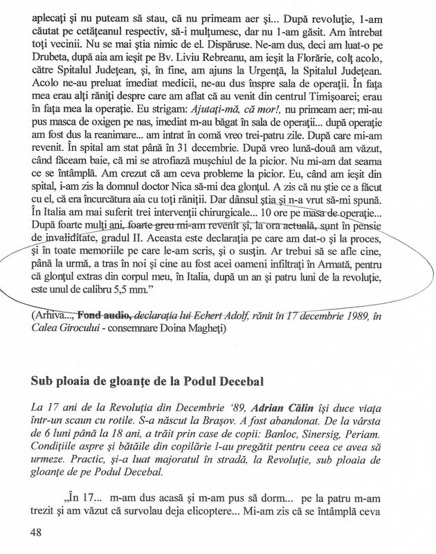 “Ar trebui să se afle cine, până la urmă, a tras în noi şi cine au fost acei oameni infiltraţi în Armată, pentru că glonţul extras din corpul meu, în Italia, după un an şi patru luni de la revoluţie, este unul de calibru 5,5 mm.” (declaraţia lui Echert Adolf, rănit în 17 decembrie 1989, în Calea Girocului)