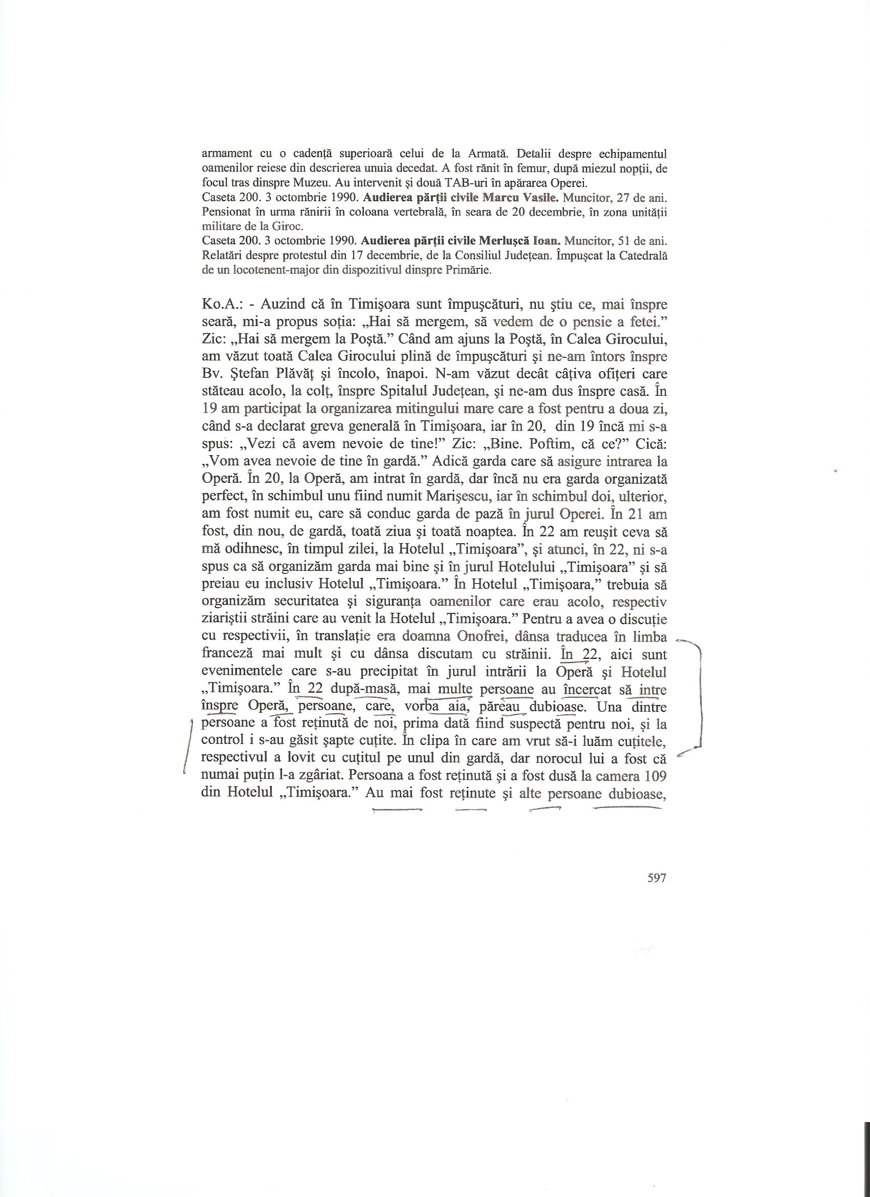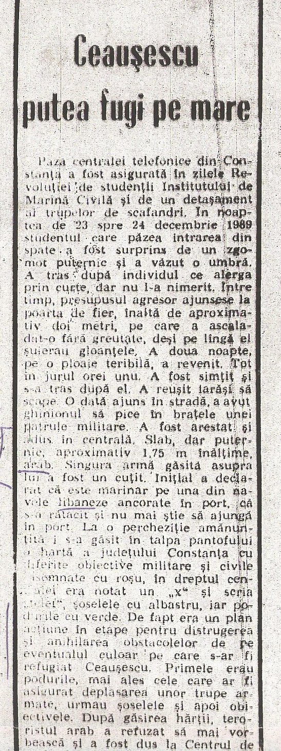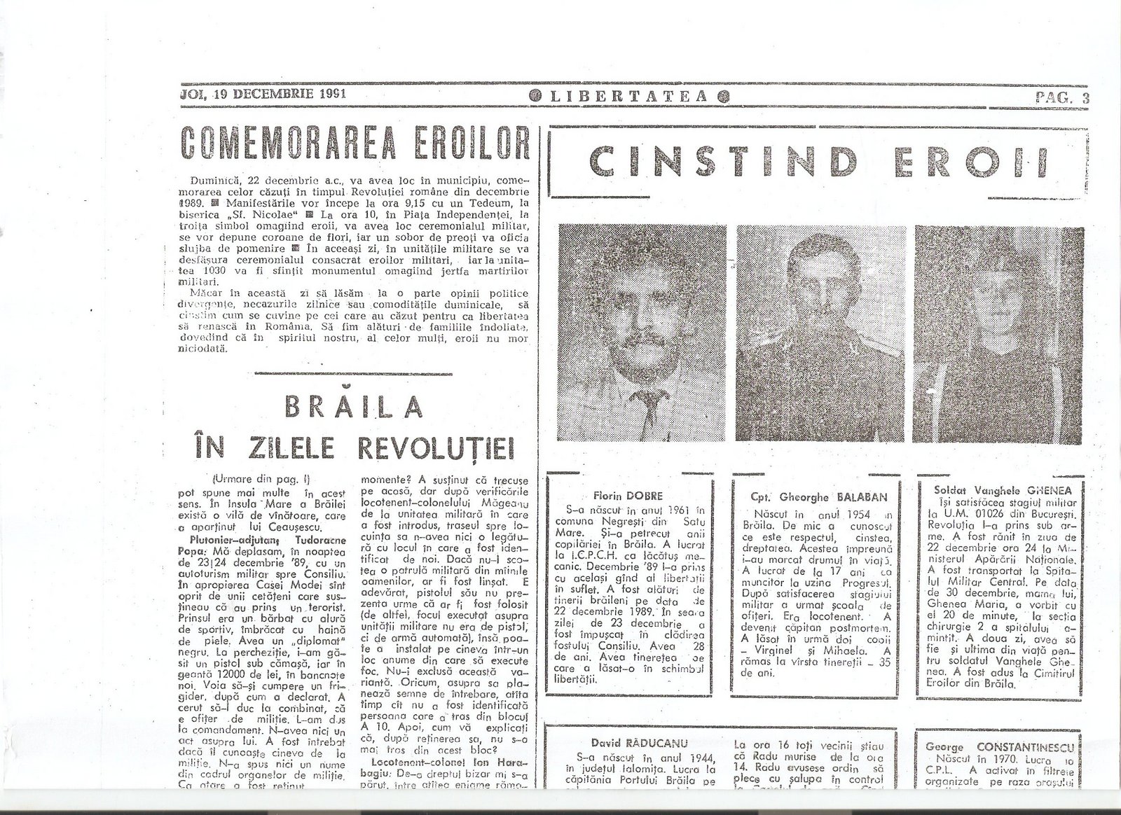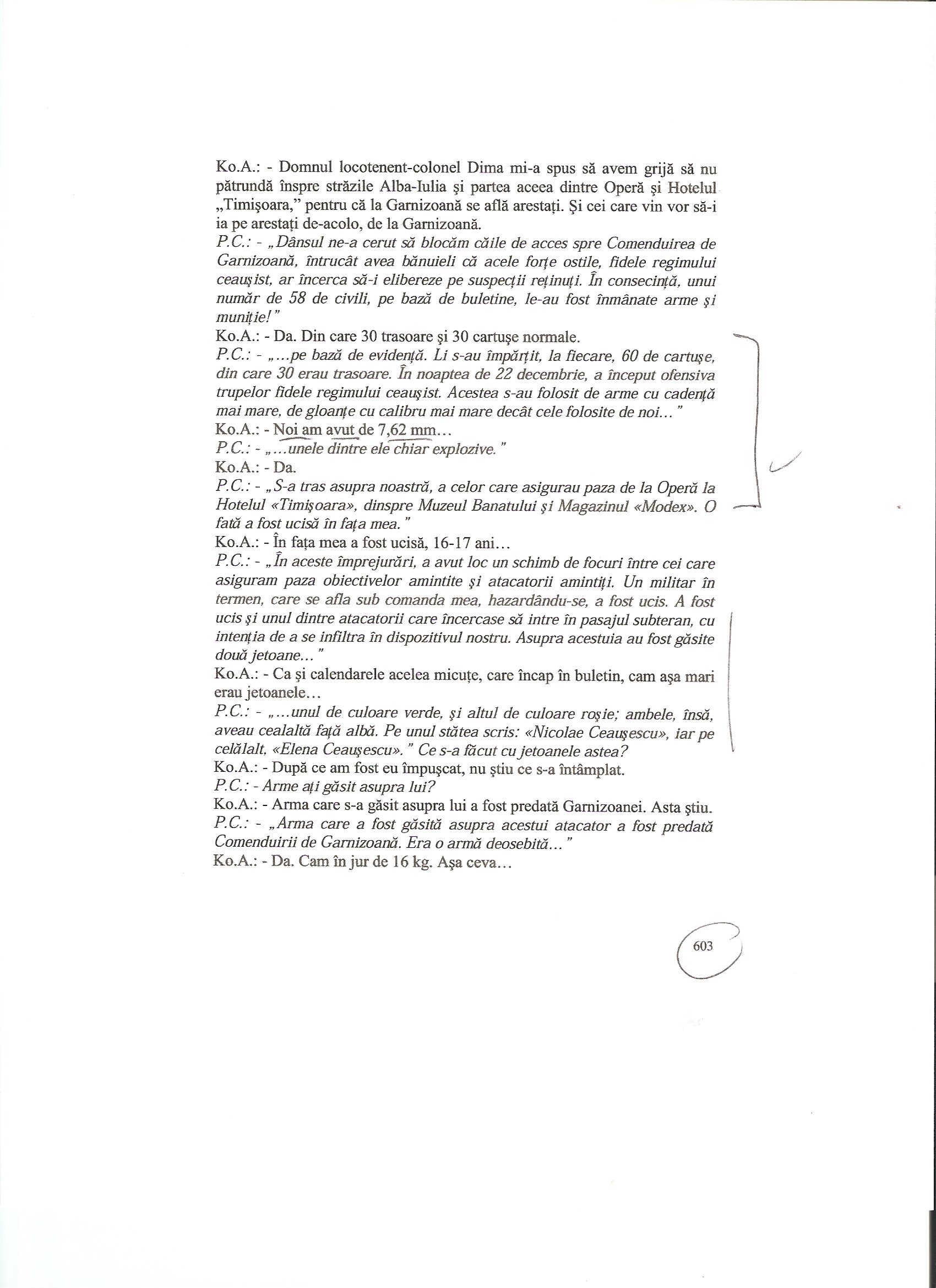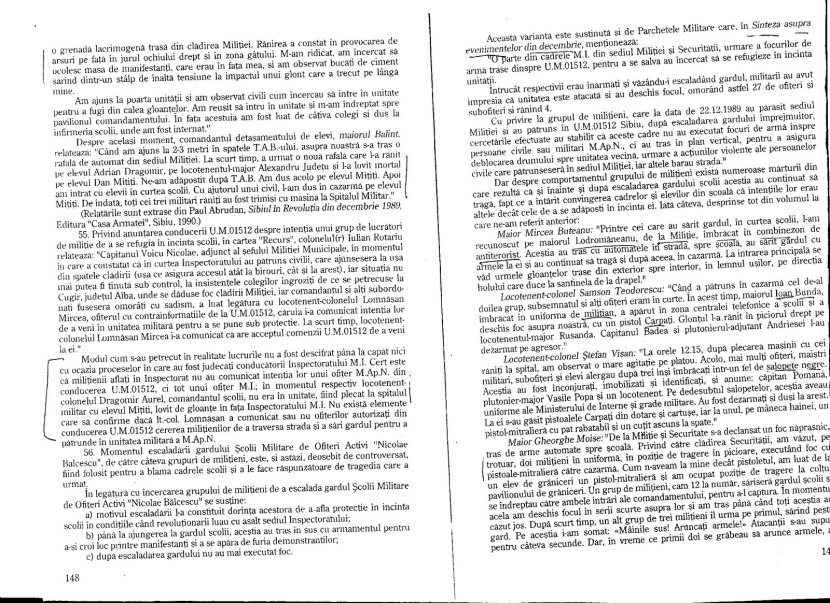 “Totodata eu cred ca (seful Securitatii locale, Col.) Dinu nu era strain de actiunile desfasurate impotriva unitatii. De pilda, intr-o noapte, m-a scos afara, in curtea unitatii, si auzind in oras zgomote, imi spunea, ‘Fii atent, astea sunt ABI-uri…In 10 minute, incep sa traga…’ Stia totul, de parca isi confirma un plan cunoscut dinainte. Si mi-a mai spus, ‘Teroristii si antiteroristii sunt pregatiti dupa aceleasi principii si reguli, fac aceeasi instructie.'”