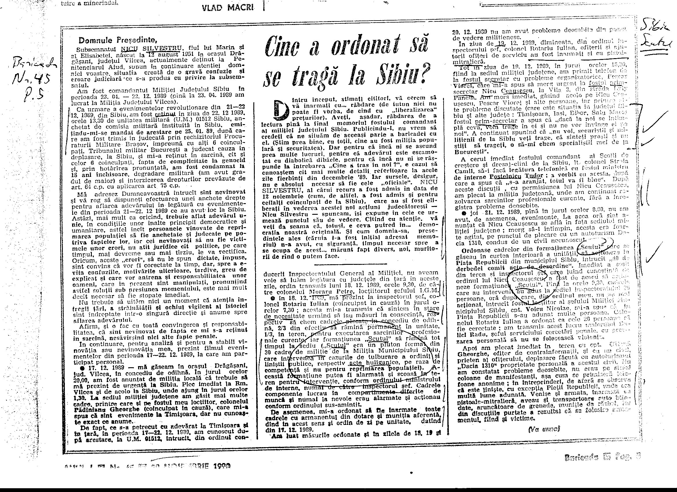 How then does one explain the following conundrum:  the selective treatment of the letters and declarations of former Securitate Director General Iulian Vlad?  Oh, yes, the text of General Vlad’s letters which allege he was a stooge and victim of Ion Iliescu, etc. can be found in the Romanian press.  No problem!  But what about his declaration of 29 January 1990, where he deftly admits the responsibility of his institution for the bloodshed of December?  What, that not sensationalist enough, different enough to sell papers?  That’s not “anti-communist” enough for publication?  Is it somehow less credible than the other letters whose text has been published without problem?  24 plus years later, the Romanian media has yet to publish this document!  Could it be that the problem with this declaration is that it does not fit with and undermines the other popular narratives of December 1989 that minimize and even absolve the former Securitate of responsibility for the bloodshed of December 1989?