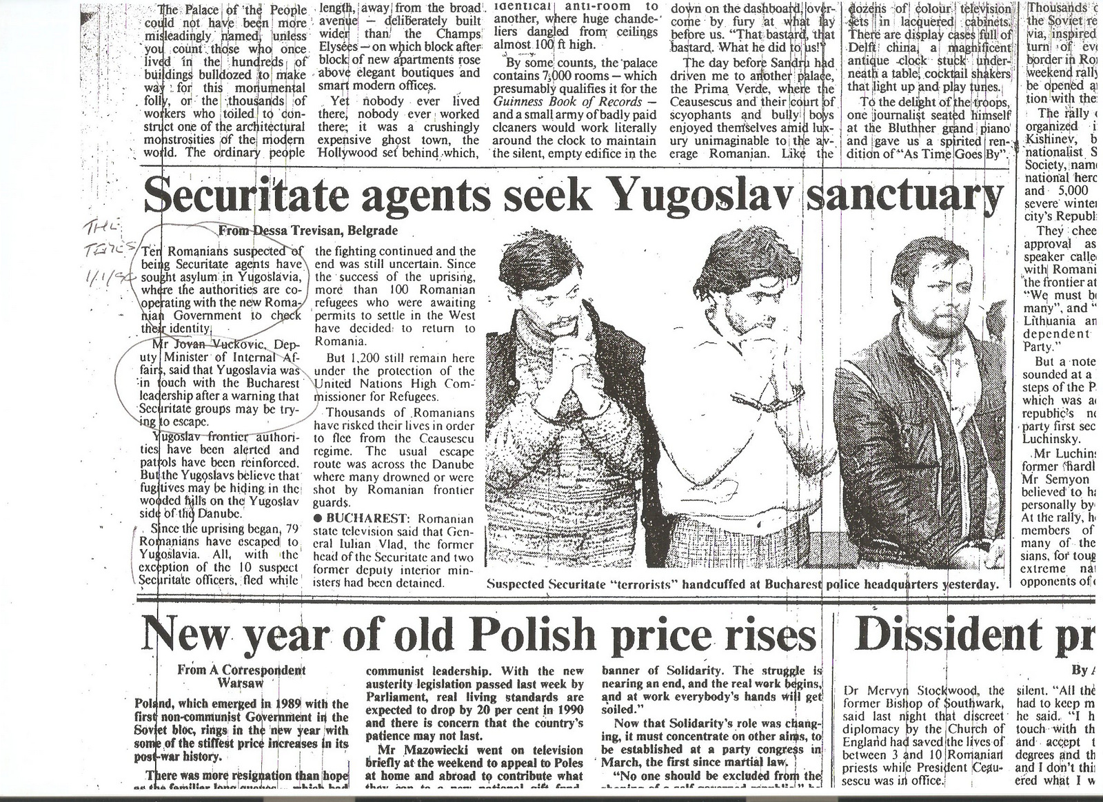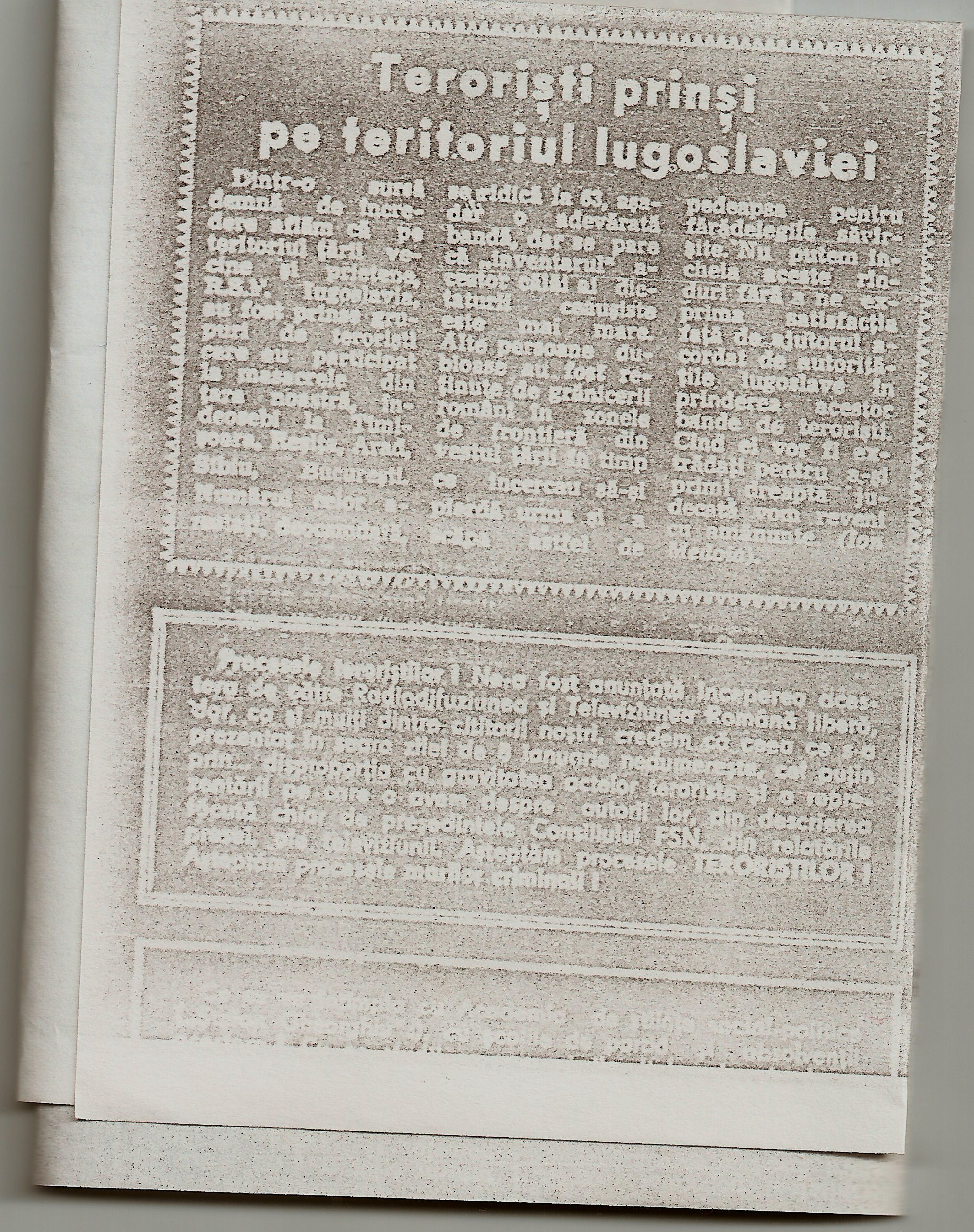 [4]Professor Andrei Firica, interview by Florin Condurateanu, “Teroristii din Spitalul de Urgenta,” Jurnalul National, 9 March 2004, online edition, cited in Hall, “Orwellian…Positively Orwellian” http://homepage.mac.com/khallbobo/RichardHall/pubs/Voineaswar091706.html. For similar accounts, see Florin Mircea Corcoz si Mircea Aries, “Terorist ascuns in Apuseni?” Romania Libera, 21 August 1992, p. 1–“Colonelul Ghircoias, former director of the Securitate’s penal investigative unit, brought together the individuals accused of being terrorists and made them disappear”; Andreea Hasnas, “Reportajul unui film cu TERORISTI,” Expres, no. 10 (6-12 aprilie 1990), p. 5; Constantin Fugasin, “Unde ne sint teroristii?” Zig-Zag, 1990.