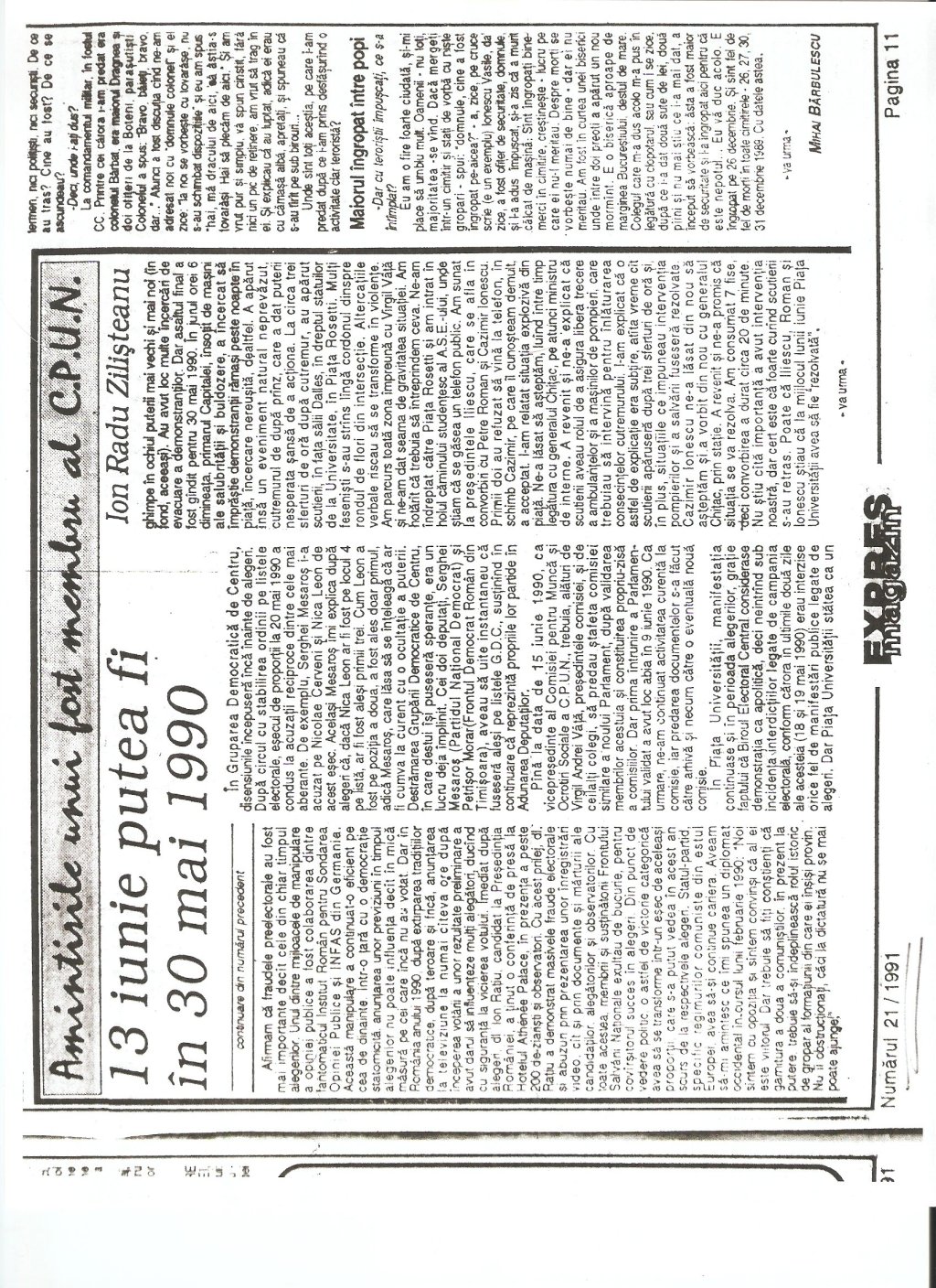 The self-description by senior Front officials (Ion Iliescu) and media promoters (such as Darie Novaceanu in Adevarul) of the FSN (National Salvation Front) as the “emanation of the Revolution” does not seem justified. It seems directly tied to two late January 1990 events—the decision of the Front’s leaders to run as a political party in the first post-Ceausescu elections and the contestation from the street of the Front’s leaders’ legitimacy to rule and to run in those elections. It also seems difficult to defend objectively as a legitimate description, since even according to their own accounts, senior Front officials had been in contact with one another and discussed overthrowing the Ceausescus prior to the Revolution, since there had existed no real competing non-Ceausescu regime alternative on 22 December 1989 (an argument they themselves make), and since they had clearly not been elected to office. Moreover, when senior former Front officials, Iliescu among them, point to their winning of two-thirds of the votes for the new parliament in May 1990 and Iliescu’s 85 percent vote for the presidency, the numbers in and of themselves—even beyond the by now pretty obvious and substantiated manipulation, surveillance, and intimidation of opposition parties, candidates, movements and civil society/non-governmental organizations that characterized the election campaign—are a red flag to the tainted and only partly free and fair character of those founding elections.