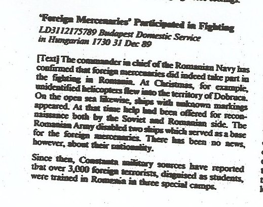 Both at the time (Foreign Broadcast Information Service of the United States Government, FBIS-EEU-89-246, 26 December 1989) and 10 years later in 2000, Karpati acknowledged the violation of Hungarian airspace by Securitate helicopters.  He didn’t have any doubt, these were not just the alleged suppositions of Hungarian journalists, and more than a decade after the events–in other words, after a tsunami of Securitate-inspired revisionism in Romania–he continued to maintain they belonged to the Securitate…not to the Romanian military as the timeless deniers would have us believe…