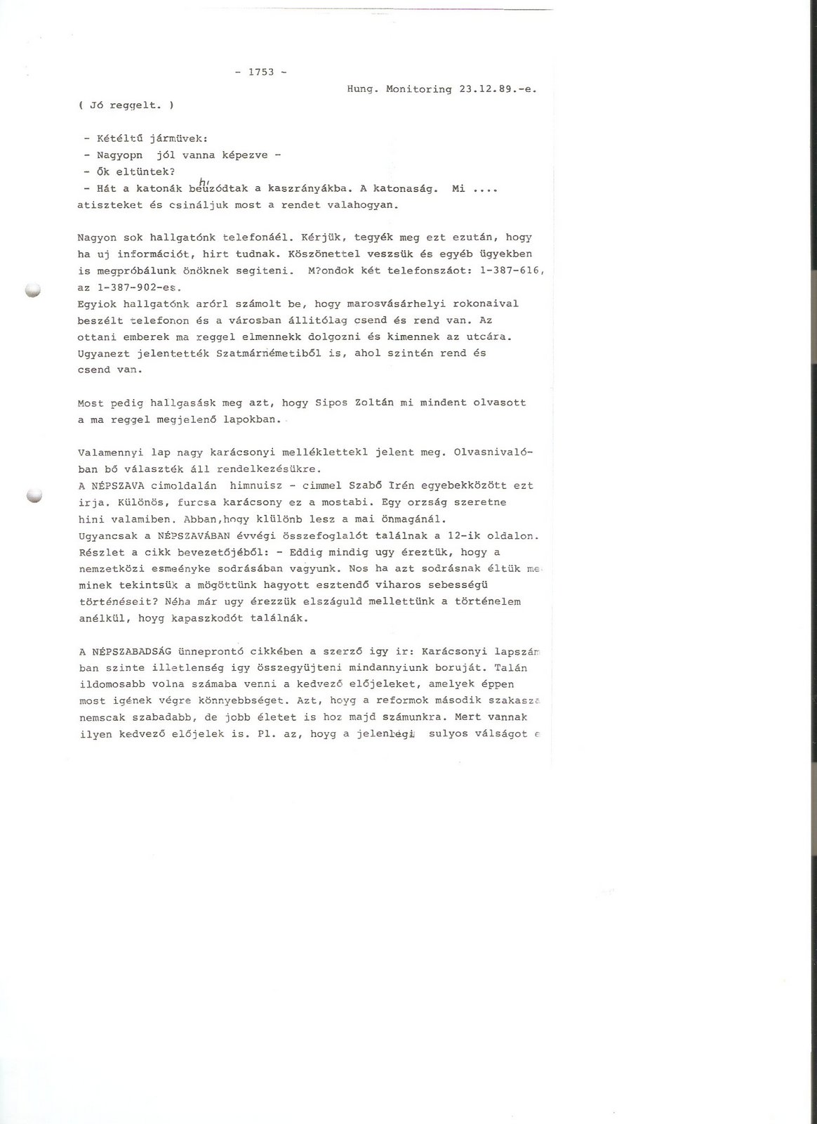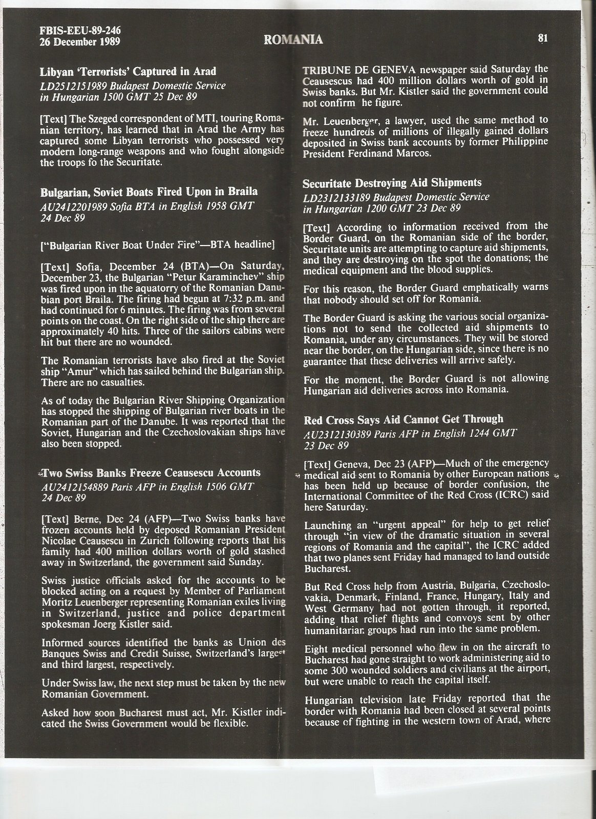 Colonel Gyorgy Keleti, head of the Hungarian People’s Army Press Department:  “…I would like to say that a progressive weakening of the Securitate has been experienced.  We ourselves can see this, because our radio searching and locating units which were in Hungary a few days ago were monitoring broadcasts from 31 Securitate radio centers–yesterday 19, and today only 5.  We of course put this data at the disposal of the Romanian military leadership.”