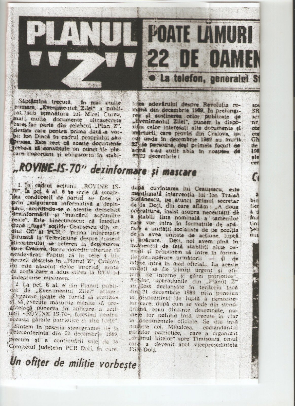 But it almost doesn’t matter when Pacepa first discussed this…because almost identical details were disclosed by Liviu Turcu, a DIE officer who had defected earlier in 1989 (thereby being far more knowledgeable of current plans/realities inside the Romanian security state), only without reference to a named plan, such as Plan Z-Z.  It was thus Turcu on 23 December 1989 (within 24 hours of the outbreak of terrorist hostilities in Romania; the interview would have taken place on Saturday the 23rd) who first informed Western media of the existence of such a plan–although it appears Turcu’s disclosures were never relayed by Romanian media or by Radio Europa Libera.