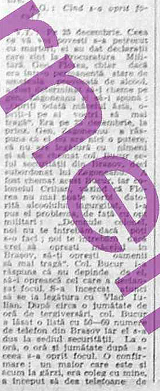 “‘Domnule colonel, noi nu te intrebam daca poti s-o faci, noi te intrebam daca vrei sa opresti macelul in Brasov, s-ti opresti oamenii sa mai traga.’ Col Bucur [Seful Securitatii] i-a raspuns ca nu depinde de el, sa-i opreasca cel care a declansat focul. S-a incercat atunci sa se ia legatura cu Vlad Iulian. Dupa circa o jumatate de ora de tergiversari, col. Bucur a lasat o lista cu 50-60 numere de telefon din Brasov iar el s-a dus la sediul securitatii. La o ora, o ora si jumatate dupa aceea s-a oprit focul. O confirmare: un maior care este si acum la garzi, era coleg cu mine, a inceput sa dea telefoane de acolo, din sediu. La un moment dat a primit un telfon prin care era cautat gen. Zagoneanu [Sef Inspectoratului M.I.] sau col. Bucur, cel care telefona prezentindu-se drept un subordonat de al lor. Acest maior a raspuns ca nici ? era acolo ? si ca ? ? ? la telefon. Interlocutorul ? a intrebat atunci daca este adevarat (?) ca s-a dat ordin de incetare a focului, daca nu mai trebuie sa traga.” [e greu de descifrat aici, as aprecia orice ajutor! va multumesc)