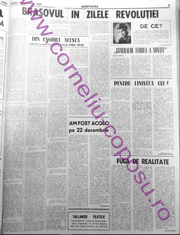 “Brasovul in Zilele Revolutiei. Din Unghiul Acesta–Interviu cu maior (in rezerva fortata) VIOREL TOCAN,” Dreptatea, 23 decembrie 1990, p. 3