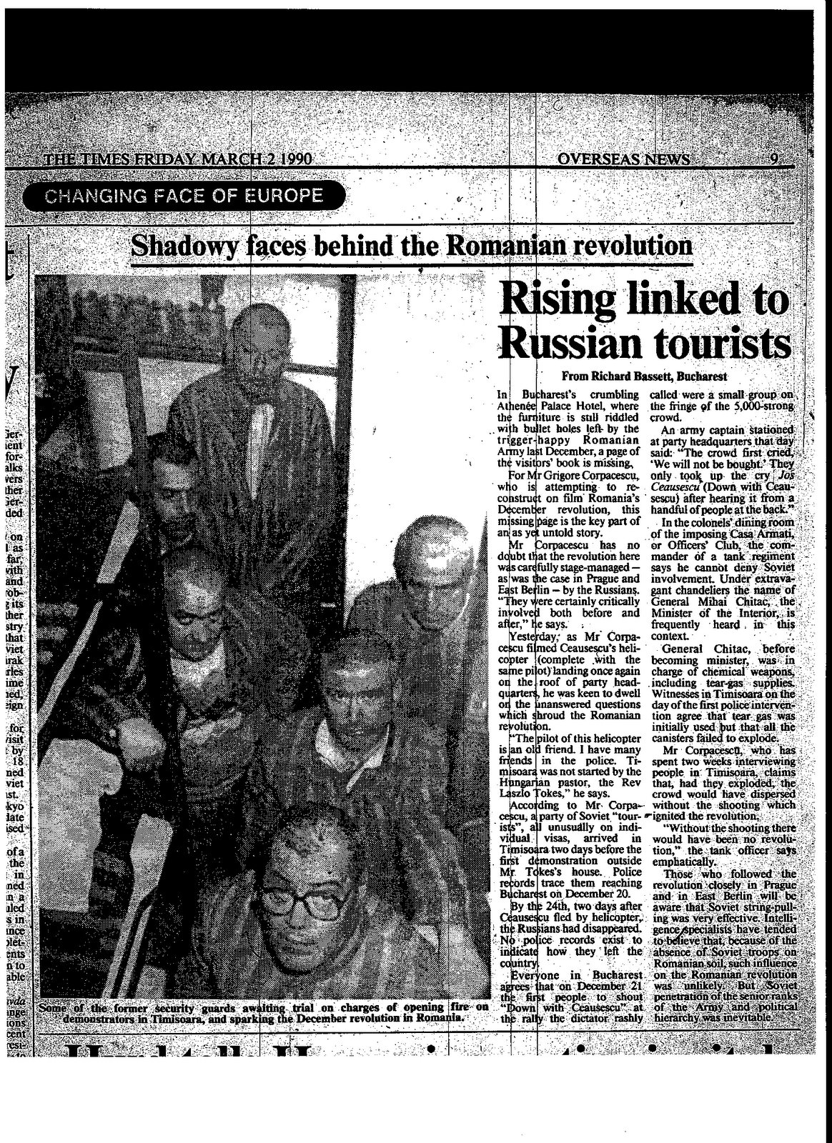 “Mr. [Grigore] Corpacescu has no doubt that the revolution here was carefully stage-managed—as was the case in Prague and East Berlin—by the Russians…According to Mr. Corpacescu a party of Soviet ‘tourists,’ all usually on individual visas, arrived in Timisoara two days before the first demonstration outside Mr. [i.e. Pastor] Tokes’ house. Police records trace them reaching Bucharest on December 20. By the 24th, two days after Ceausescu fled by helicopter, the Russians had disappeared. No police records exist to indicate how they left the country. (“The Times (London),” 2 March 1990)