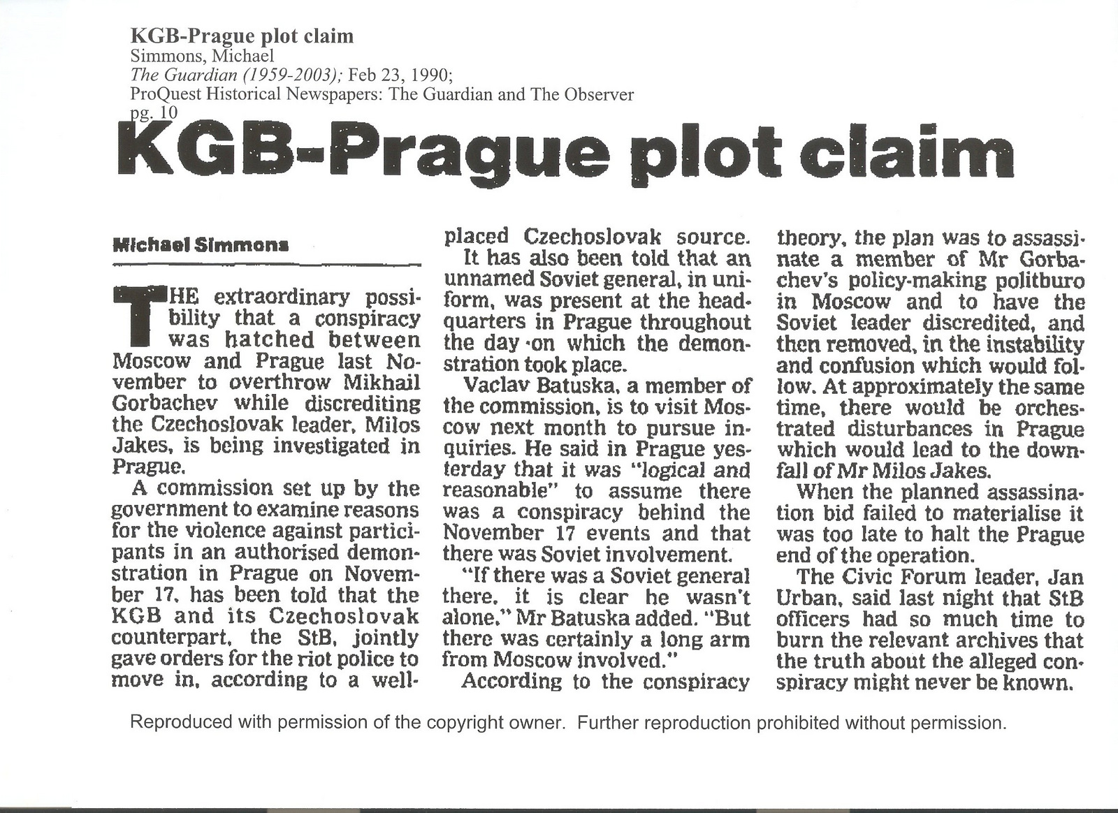 The initial salvo in the Czech case appears to have been Michael Simmons’ 23 February 1990 article in The Guardian entitled, “KGB–Prague Plot Claim.” Dr. Kieran Williams later clarified, however, how deeply compromised these early commissions to investigate the events of the Velvet Revolution–most notably, the circumstances surrounding the events of 17 November 1989–were (see http://english.360elib.com/datu/U/EM309205.pdf pp. 45-48, pp. 53-54), containing among their ranks, almost inevitably, collaborators of the communist-era Czechoslovak secret service, the StB. Most notably, when one reads the Simmons account, cited by the commission as coming from a “well-placed Czechoslovak source,” the outlined conspiracy leaves the impression that 1) the StB did not intentionally engage in violence to prevent the fall of the communist regime (rather it allegedly encouraged unrest to replace Milos Jakes), and 2) they were in control and prepared for the initial stages of what happened. Thus, the StB appears both clean AND competent, only being upended by circumstances beyond their control. One suspects that the commission’s “well-placed source” was someone connected to the old regime, and perhaps from the StB itself, and thus with a vested interest in demonstrating retrospectively that their actions were noble and clairvoyant.