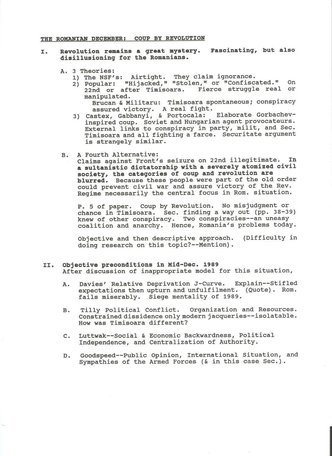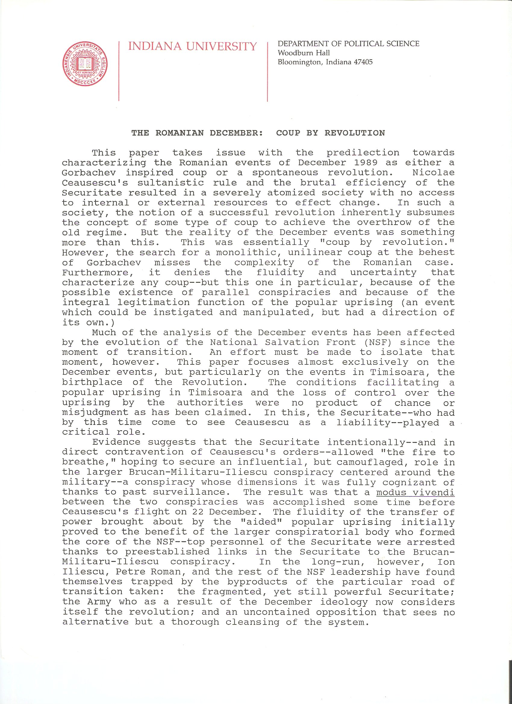 I cannot find the paper upon which the precis was based. I do know I wrote it for a class in the fall of 1990 and revised it through the early months of 1991, in the lead-up to the conference. I also recall that my conclusions were based on what I had heard while visiting Romania for three weeks in July 1990, English and French language newspaper articles, radio reports and television documentaries, and articles from publications we received at Indiana University, the opposition daily Romania Libera and the weeklies Zig-Zag and Flacara, among others, as I was beginning to study Romanian at the time (the late Ilinca Zarifopol Johnston, my first Romanian teacher, was kind enough to help me work my way through those articles).
