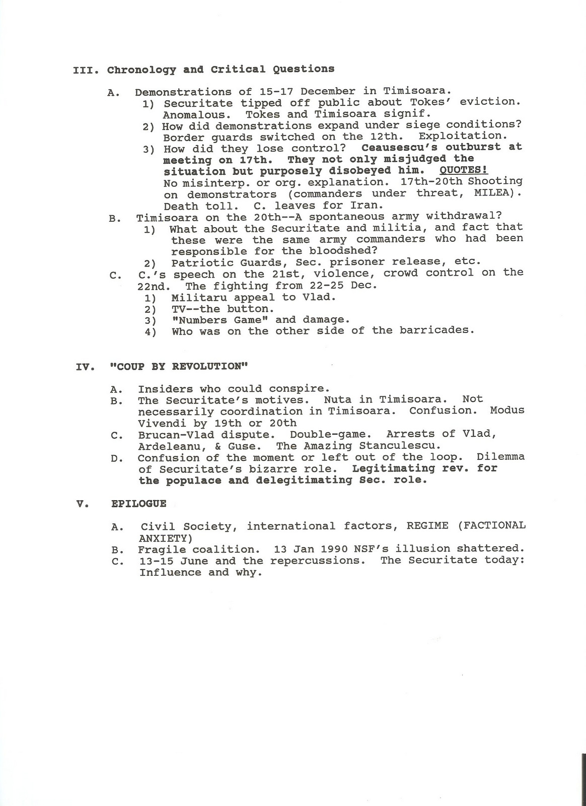 The reality is quite different. Like so many Romanians, Romanian emigres, Romanianists, and Romania observers, by late 1990, everything seemed to be pointing in a far different direction than we thought in December 1989 and immediately after. Below, my precis and presentation summary [I rambled and went way over time!] for an April 1991 conference at my undergraduate alma mater, the University of Virginia. A key sentence that jumps out is the following: “Evidence suggests that the Securitate intentionally–and in direct contravention of Ceausescu’s orders–allowed “the fire to breathe,” [in Timisoara] hoping to secure an influential, but camouflaged , role in the larger Brucan-Militaru-Iliescu conspiracy centered around the military–a conspiracy whose dimensions it was fully cognizant of thanks to past surveillance.”