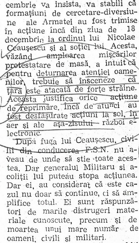 - Probatoriul administrat a reliefat mecanismele dezinformărilor constante, având consecințe deosebit de grave, lansate prin intermediul TVR, Radiodifuziunii și mijloacelor militare de comunicații, astfel fiind instaurată la nivel național binecunoscuta psihoză teroristă.