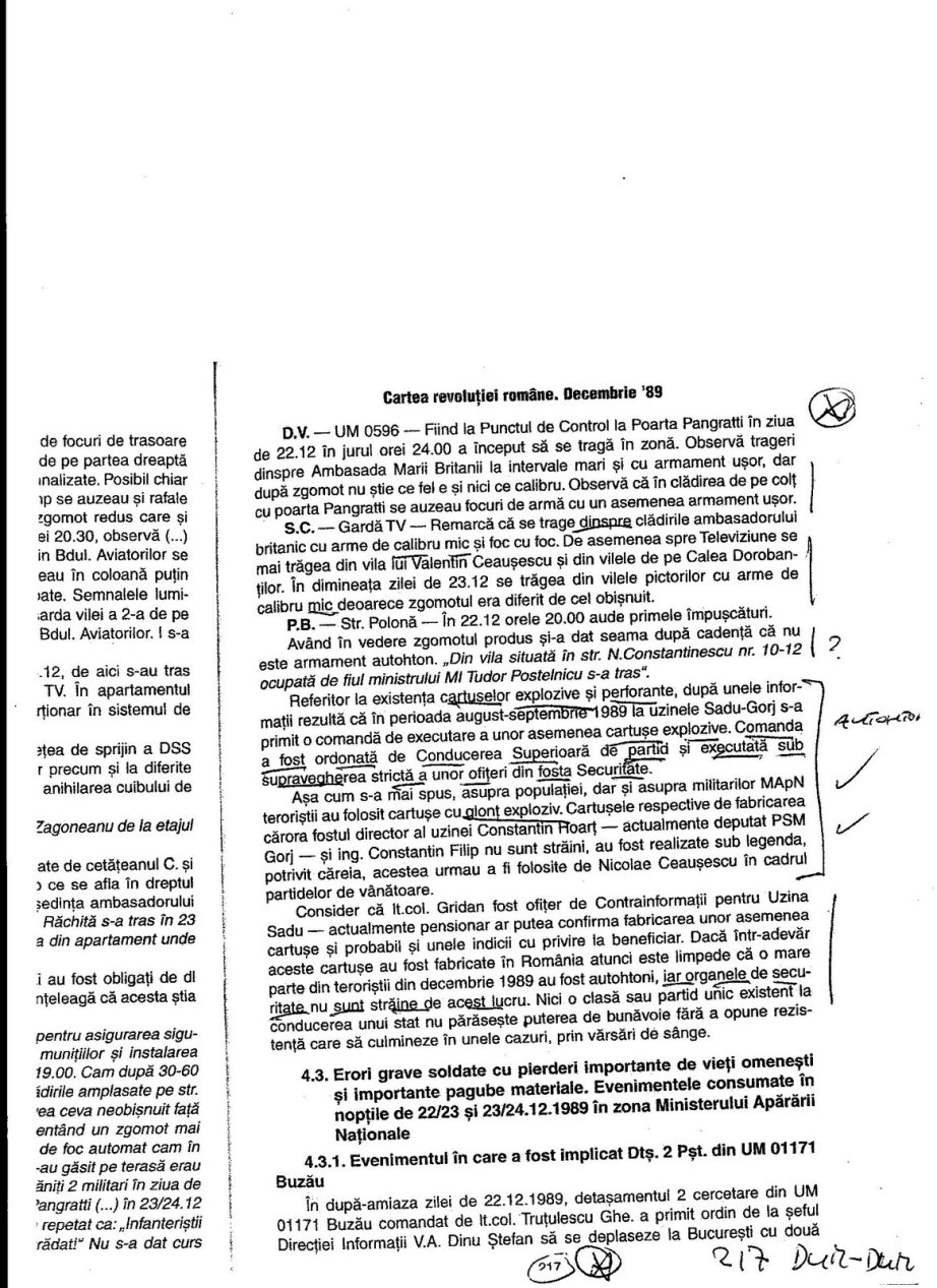 Din Directia a V-a, din depozitul de munitie, au fost scoase pe 23-24 decembrie 1989 cartuse DUM-DUM, cartuse speciale care nu se potriveau la nici o arma din dotarea M.Ap.N. S-au gasit trei-patru cutii cu astfel de cartuse. Gloantele speciale, erau lungi de 5-6 cm si putin mai groasa decit un creion. Un astfel de cartus avea in virf o piatra alba, transparenta. Toate aceste cartuse i le-am prezentat personal, spre a fi filmate, d-lui Spiru Zeres. Toate cartusele speciale, in afara de DUM-DUM era de provenienta RFG-ista. Din Directia a V-a au fost predate U.M. 01305. Capitan doctor Panait, care a spus ca pina atunci nu vazuse astel de munitie, maior Puiu si captian Visinescu stiu de ele.