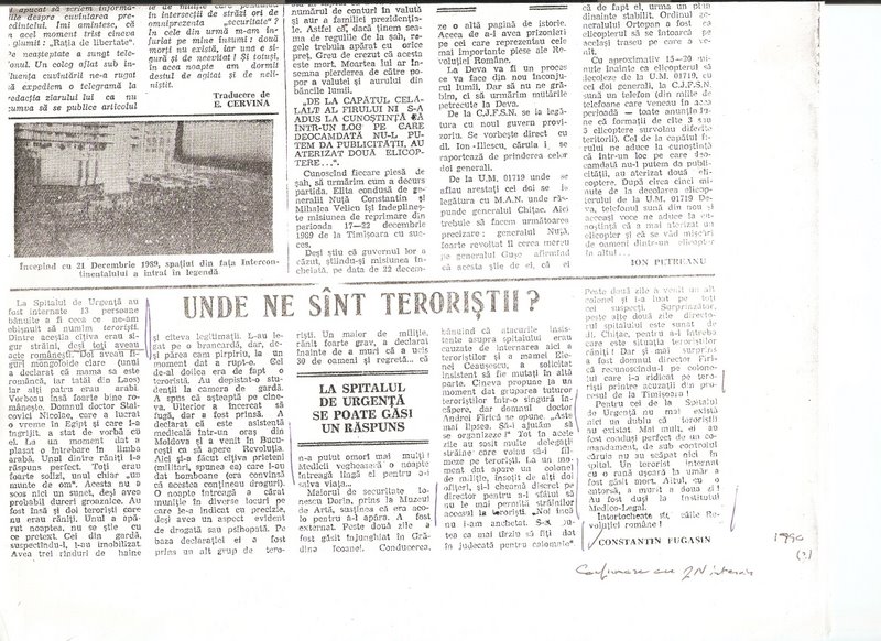 At the Emergency Hospital 13 suspected of being what we call terrorists were interned. Among these a few were definitely foreign, even though all had Romanian papers. Two clearly had ‘Mongoloid’ (‘Asiatic’) features (one stated that his mother was Romanian, while his father was from Laos), while four others were Arabs. Nevertheless, they spoke Romanian very well. Doctor Nicolae Staicovici, who worked a time in Egypt and who treated them for a time spoke with them. At a moment, he formed a question in Arabic. One of the injured responded to him perfectly. All were well-built, one was a ‘mountain of a man.’ He said nothing, although he probably had terrible pains. There were also two terrorists who were not wounded. One arrived at night, under some pretext. Those on guard suspecting him, immobilized him. He had on three layers of clothing and several ids. They tied him to the stretcher, but although he appeared rather frail, at a given moment he ripped the restraints off.[6]]