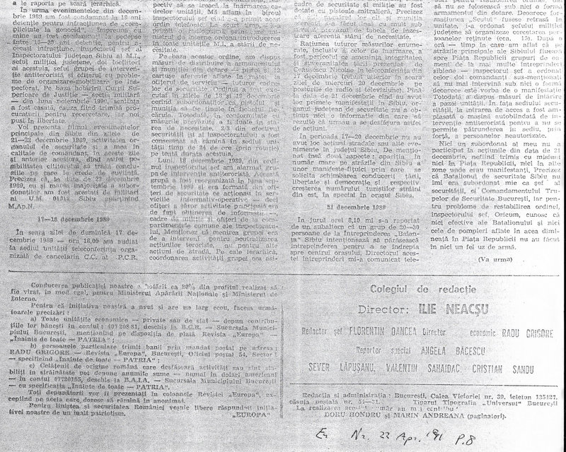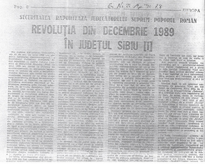 I finally (re-)unearthed this. The xerox is from spring 1997, Babes-Bolyai University Cluj Library. It cannot settle the argument between Madalin Hodor and Cornel Michalache from 2017 about whether it was actually Iulian Vlad or Nicolae Ceausescu who gave the order to “radically liquidate” protesters. (Hodor reproduced the page from Alexie Stefan’s journal which shows Vlad relaying these words, but it is not clear whose words they were. Still, the words were being relayed by Vlad.) Theodor Petrisor’s letter to the former Securitate mouthpiece Europa published in April 1991–and especially the order from Alexie Stefan quoted in the title above–does cast immense doubt on Alexie Stefan’s claims before the Gabrielescu Senatorial Commission in 1994 in which he claimed he was too sick to do much in December 1989, and consequently, on Mihalache’s clear intent to take Alexie’s 1994 at face value.