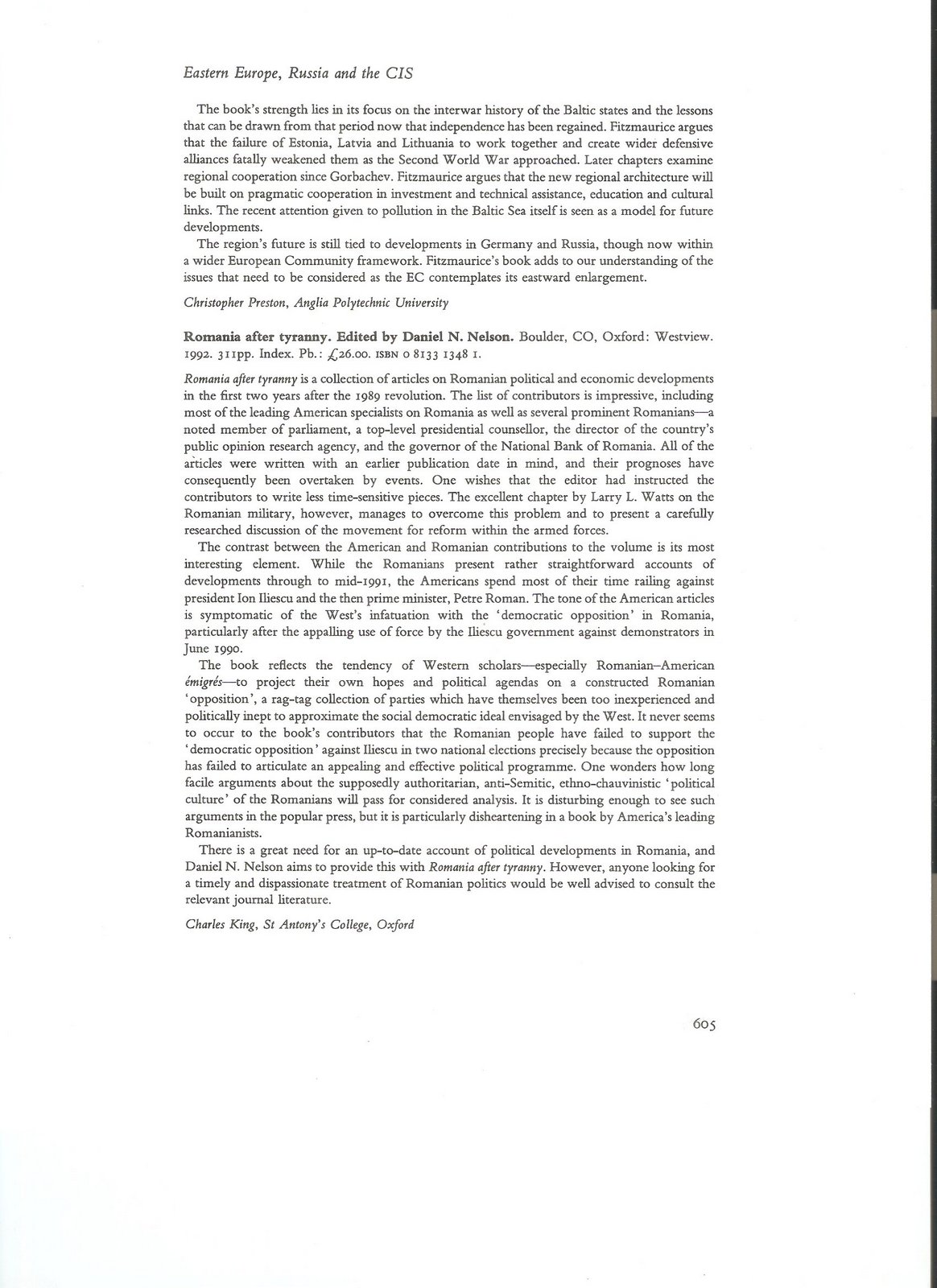 The book reflects the tendency of Western scholars–especially Romanian-American emigres–to project their own hopes and political agendas on a constructed Romanian ‘opposition’, a rag-tag collection of parties which have themselves been too inexperienced and politically inept to approximate the social democratic ideal envisaged by the West. It never seems to occur to the book’s contributors that the Romanian people have failed to support the ‘democratic opposition’ against Iliescu in two national elections precisely because the opposition has failed to articulate an appealing and effective political programme. One wonders how long facile arguments about the supposedly authoritarian, anti-Semitic, ethno-chauvinistic ‘political culture’ of the Romanians will pass for considered analysis. It is disturbing enough to see such arguments in the popular press, but it is particularly disheartening in a book by America’s leading Romanianists.