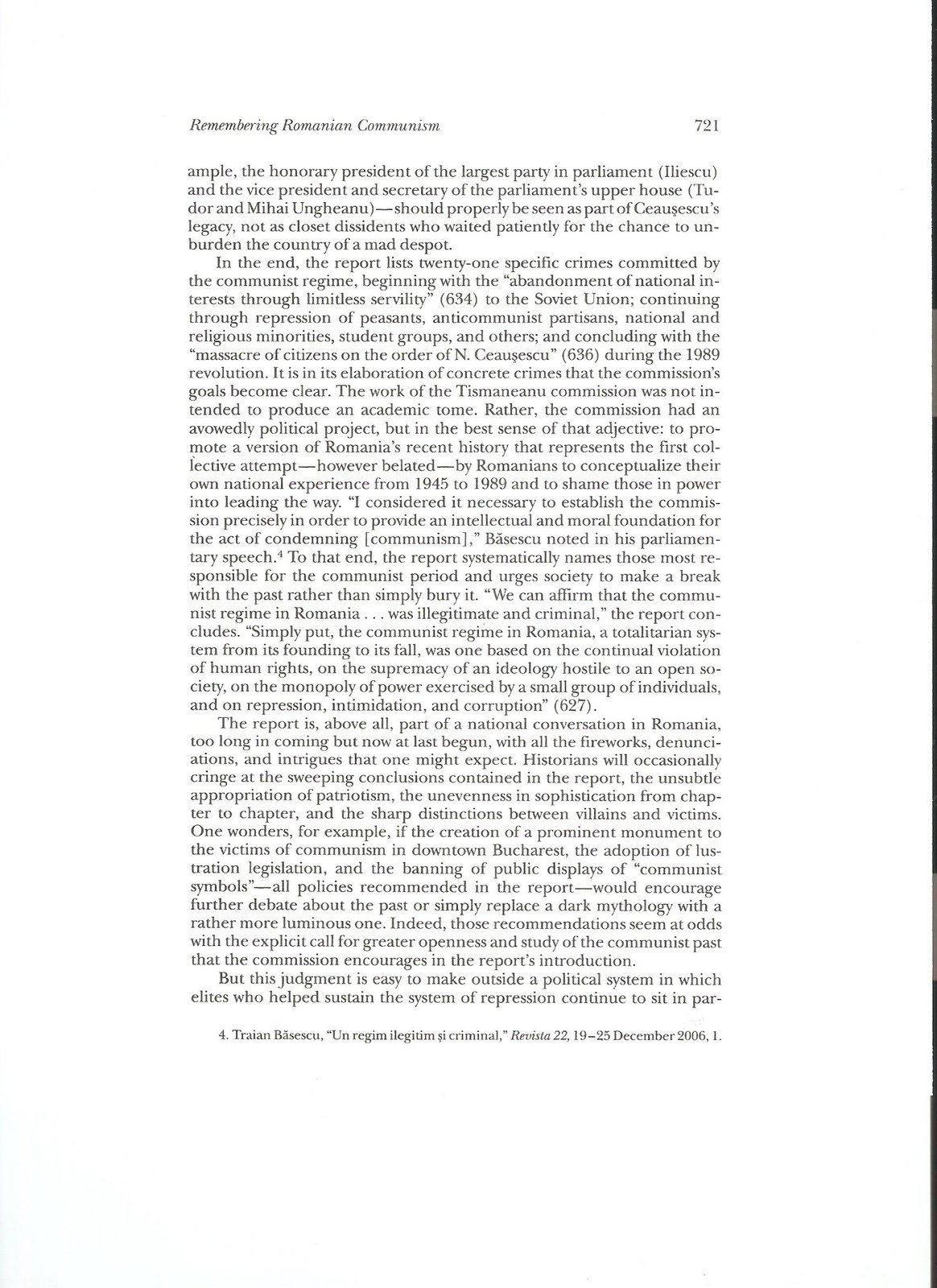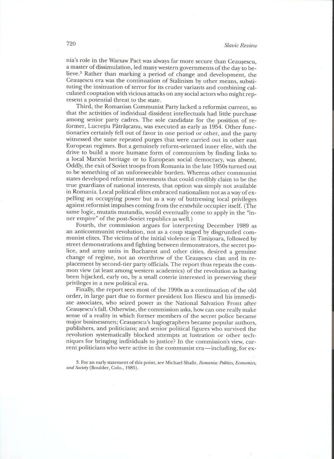 By contrast, let us see how Professor Charles King of Georgetown University reviewed the CPADCR Raport Final anchored by the very same emigre Professor Vladimir Tismaneanu of University of Maryland, College Park. (Whereas King had a few muted criticisms of the coverage of the communist era in the Final Report, he mentions without comment in an affirmative fashion the Tismaneanu Commission Report’s coverage of the very same period and events he described back in 1993 above.) This is from Slavic Review, vol. 66, no. 4 (Winter 2007), pp. 718-723. “Remembering Romanian Communism: Comisia Prezidentiala pentru Analiza Dictaturii Comuniste din Romania. Raport Final.”