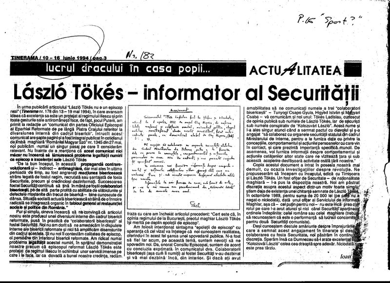 [30].. Ioan Itu, “Laszlo Tokes nu e un episcop real [Laszlo Tokes is not a real bishop],” Tinerama, no. 178 (12-19 May 1994), 2; idem, “Laszlo Tokes–informator al Securitatii [Laszlo Tokes–Securitate informer,” Tinerama, no. 182 (10-16 June 1994), 3.