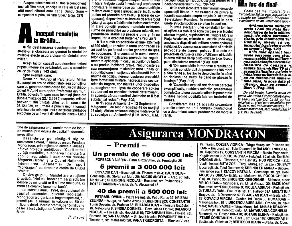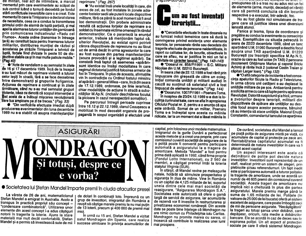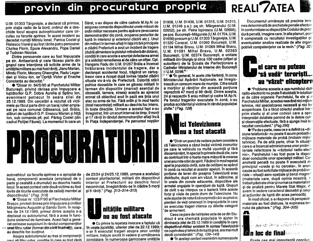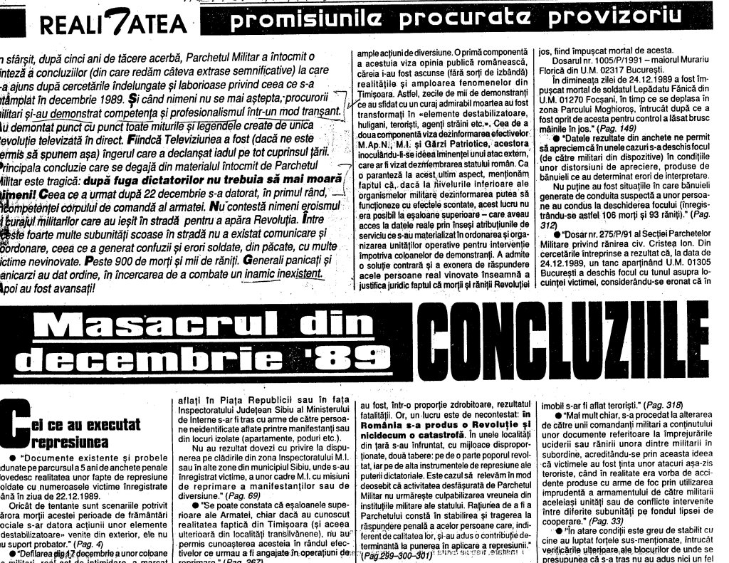 –In sfirsit dupa cinci ani de tacere acerba, Parchetul Militar a intocmit o sinteza a concluziilor (din care redam cateva extrase semnificative) la care s-a ajuns dupa cercetarile indelungate si laborioase privind ceea ce s-a intimplat in decembrie 1989. Si cind nimeni nu se mai astepta, procurorii militari si-au demonstrat competenta si profesionalismul intr-un mod transant. Au demonstrat punct cu punct toate miturile si legendele create de unica Revolutie televizata in direct. Fiindca Televiziunea a fost (daca ne este permis sa spunem asa) ingerul care a declansat iadul pe tot cuprinsul tarii. Principala concluzie care se degaja din materialul intocmit de Parchetul Militar este tragica: dupa fuga dictatorilor nu trebuia sa mai moara nimeni! Ceea ce a urmat dupa 22 decembrie s-a datorat, in primul rind, incompetentei corupului de comanda al armatei. Nu contesta nimeni eroisul si curajul militarilor care au iesit in strada pentru a apara Revolutia. Intre aceste foarte multe subunitati scoase in strada nu a existat comunicare si coordonare, ceea ce a generat confuzii si erori soldate, din pacate, cu multe victime nevinovate. Peste 900 de morti si mii de raniti. Generali panicati si panicarzi au dat ordine, incercarea de a combate un inamic inexistent. Apoi au fost avansati! (Ioan Itu***)