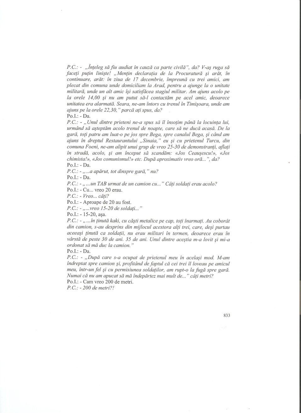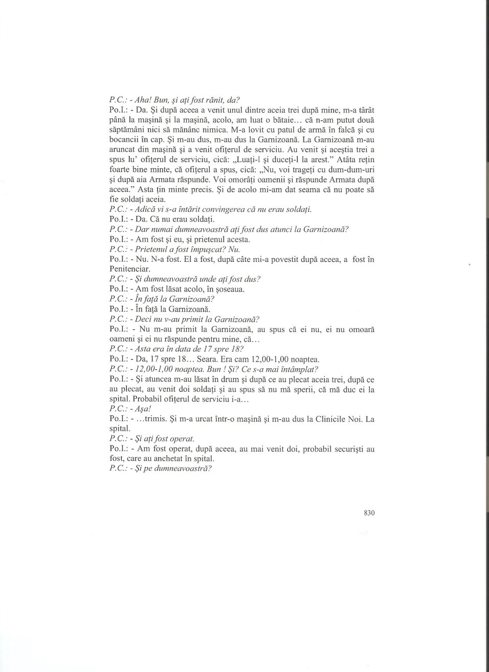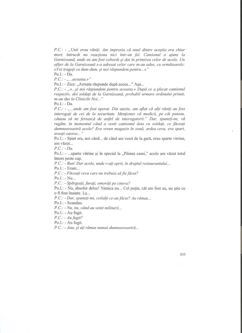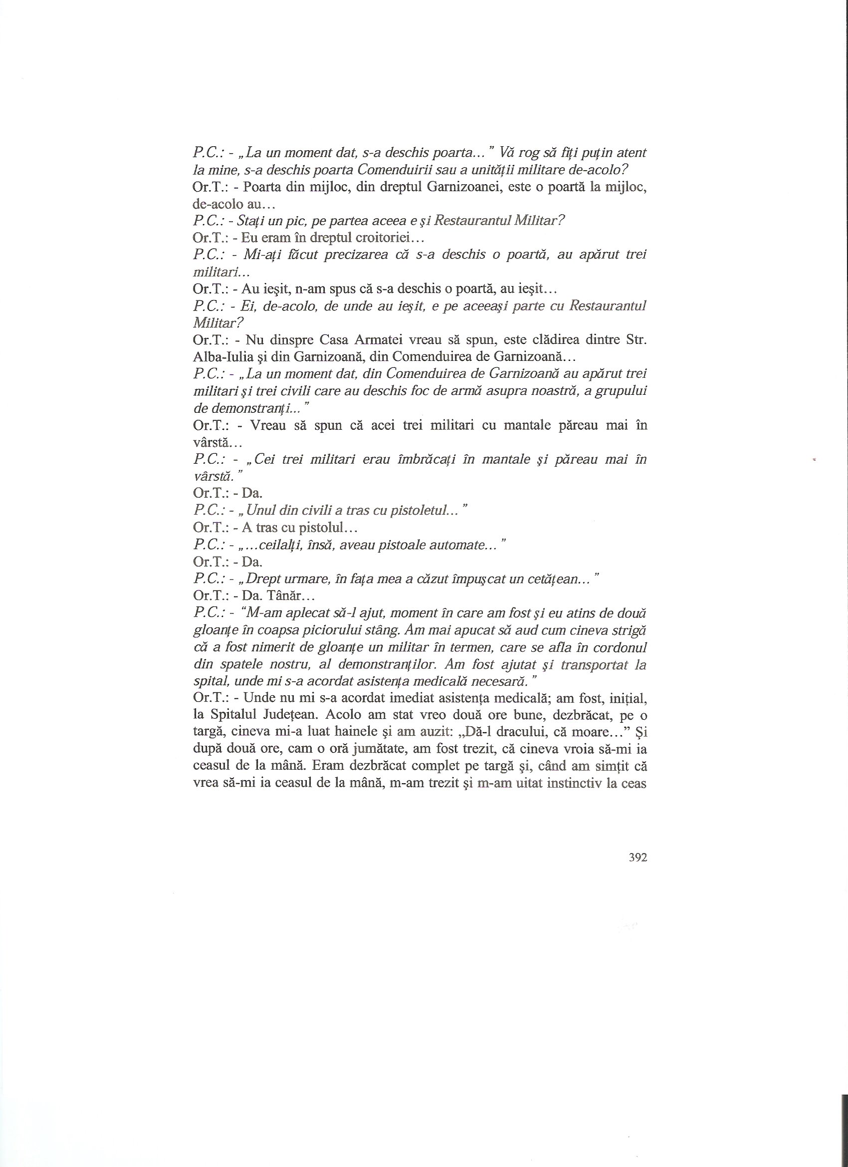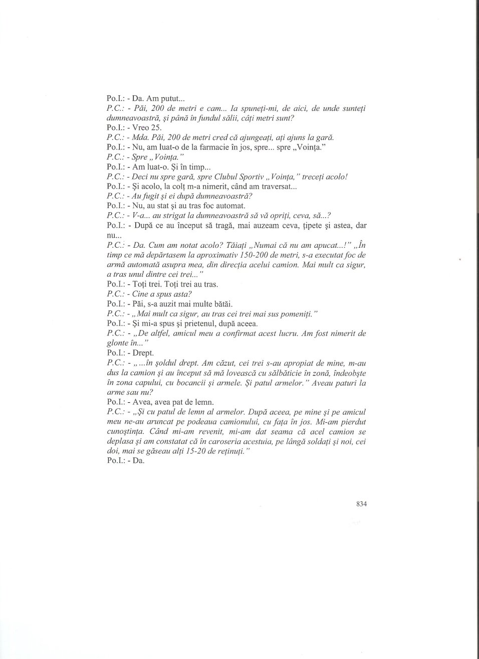 “In urma radiografiei facute la Spitalul Judetean au spus ca am 2 schije in picior…consemnat de medicul radiolog si chirurg, care m-au consultat. Convingerea mea este ca in acest atac (pe ?) Calea Girocului, asupra unor oameni pasnici si (?) s-au folosit cel putin doua tipuri de gloante, convingerea intirita de glontul scos din coapsa (?) si schijele din piciorul meu, care cred ca provin de un glonte exploziv. …Se trage sistematic si concomitent cu tragerea de lumina de catre unul din ei cu o lanterna.”