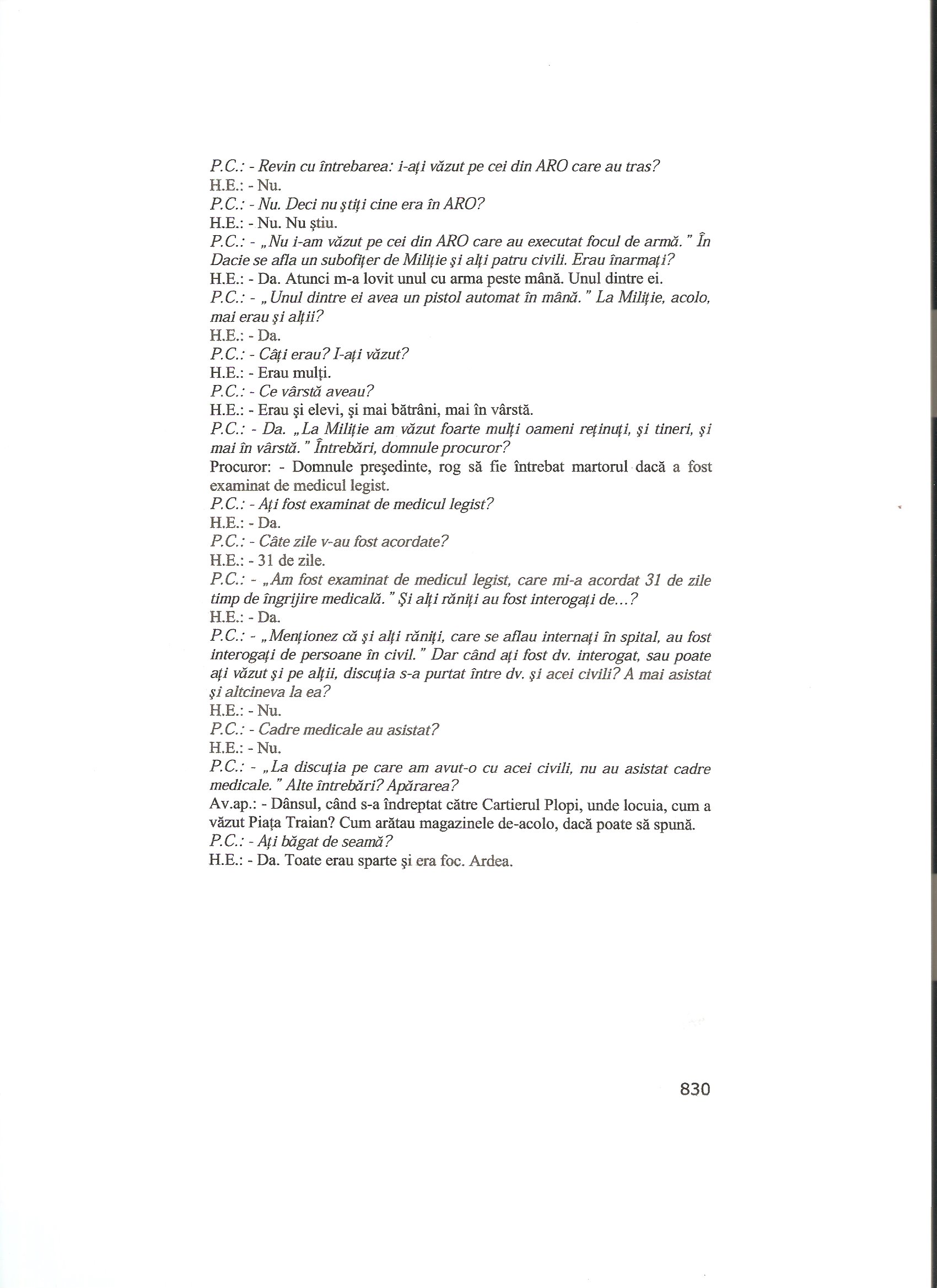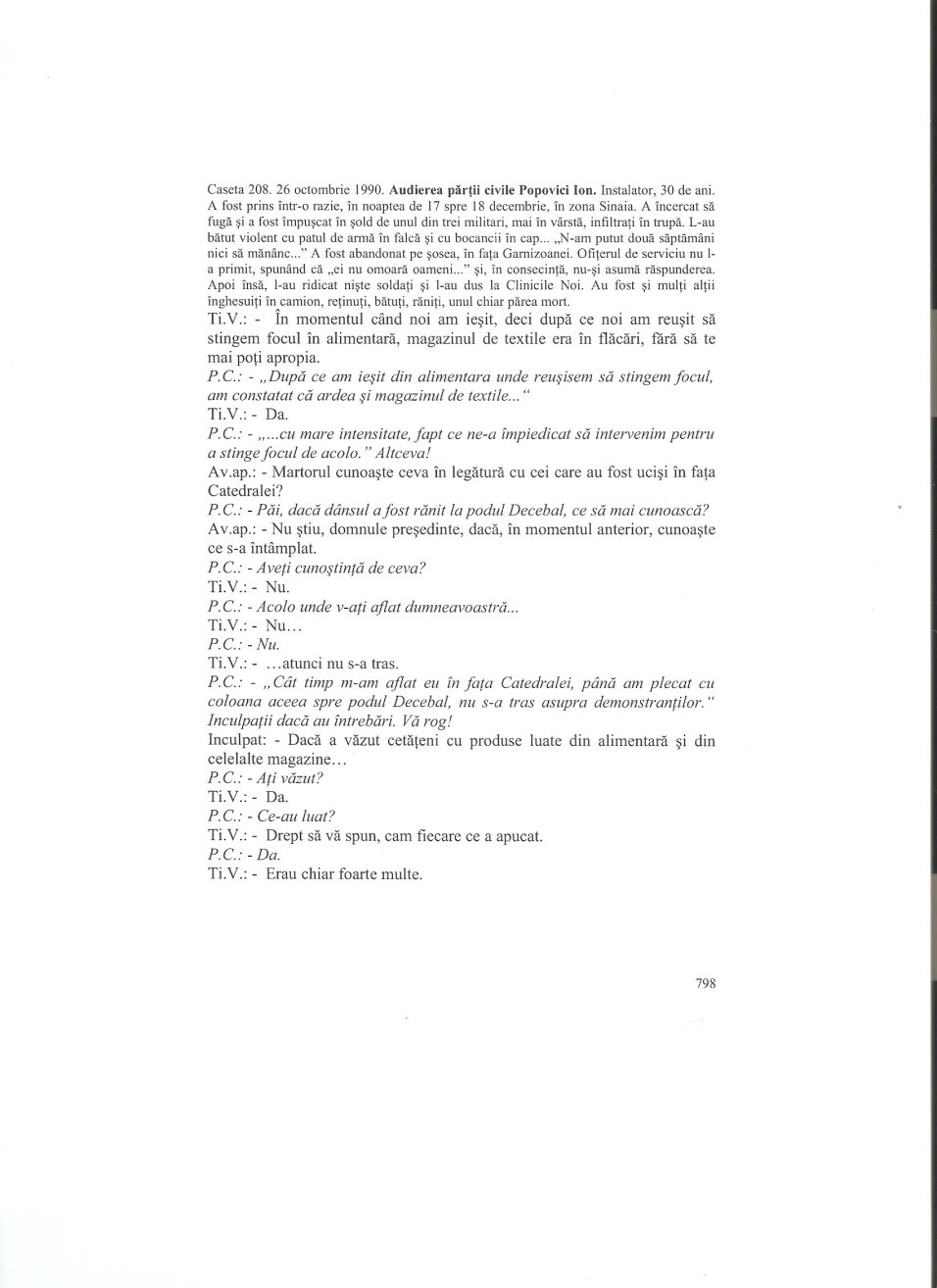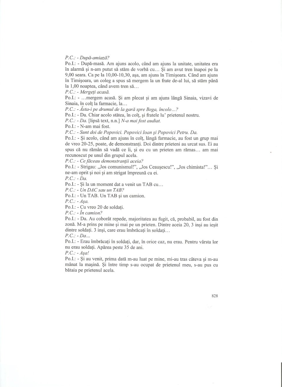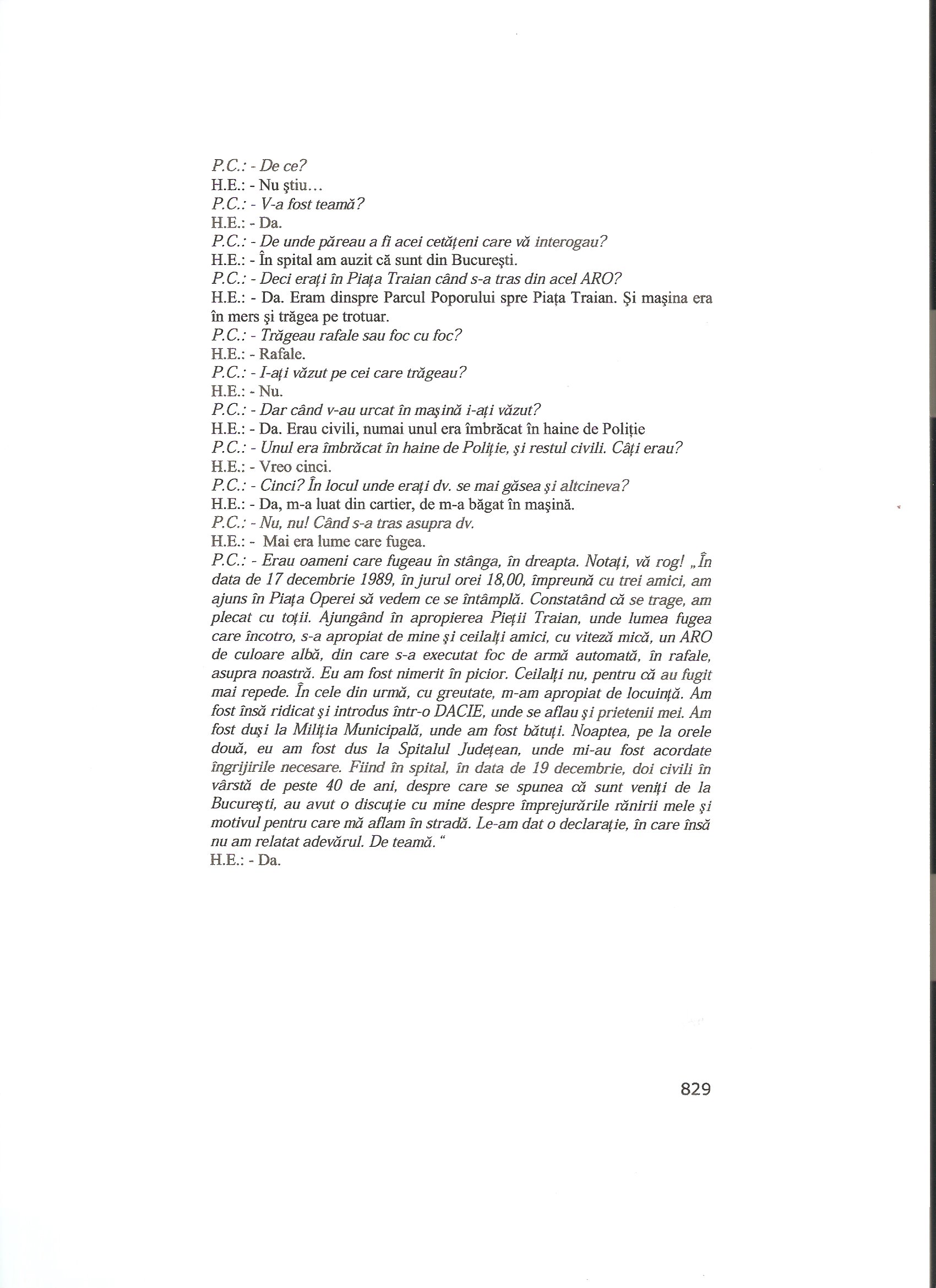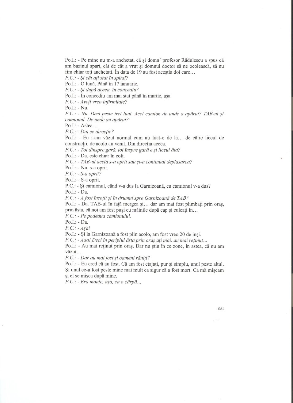 “In urma radiografiei facute la Spitalul Judetean au spus ca am 2 schije in picior…consemnat de medicul radiolog si chirurg, care m-au consultat. Convingerea mea este ca in acest atac (pe ?) Calea Girocului, asupra unor oameni pasnici si (?) s-au folosit cel putin doua tipuri de gloante, convingerea intirita de glontul scos din coapsa (?) si schijele din piciorul meu, care cred ca provin de un glonte exploziv. …Se trage sistematic si concomitent cu tragerea de lumina de catre unul din ei cu o lanterna.”
