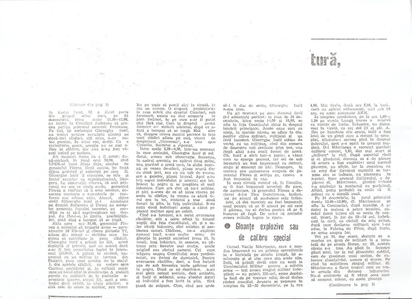 Pe 24 decembrie, in jurul prinzului (orele 12.00-13.00), dl Macrineanu se afla la Comisariat, dupa munitie. A asistat la sosirea a patru teroristi, romani (unul injura cit se poate de neaos), tineri, in jur de 18-19 ani, imbracat in civil, cu caciuli de schi prinsi, dupa cum declarau militarii care i-au adus, la Fabrica de Piine, dupa lupte, cu arme asupra lor.