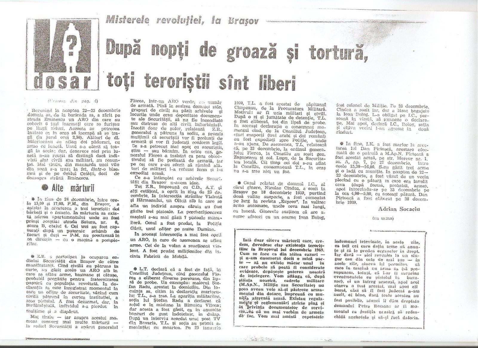 “Misterele revolutiei, la Brasov. Dupa nopti de groaza si tortura, toti teroristii sint liberi.” Adrian Socaciu, Cuvintul, nr. 1-2 ianuarie 1991