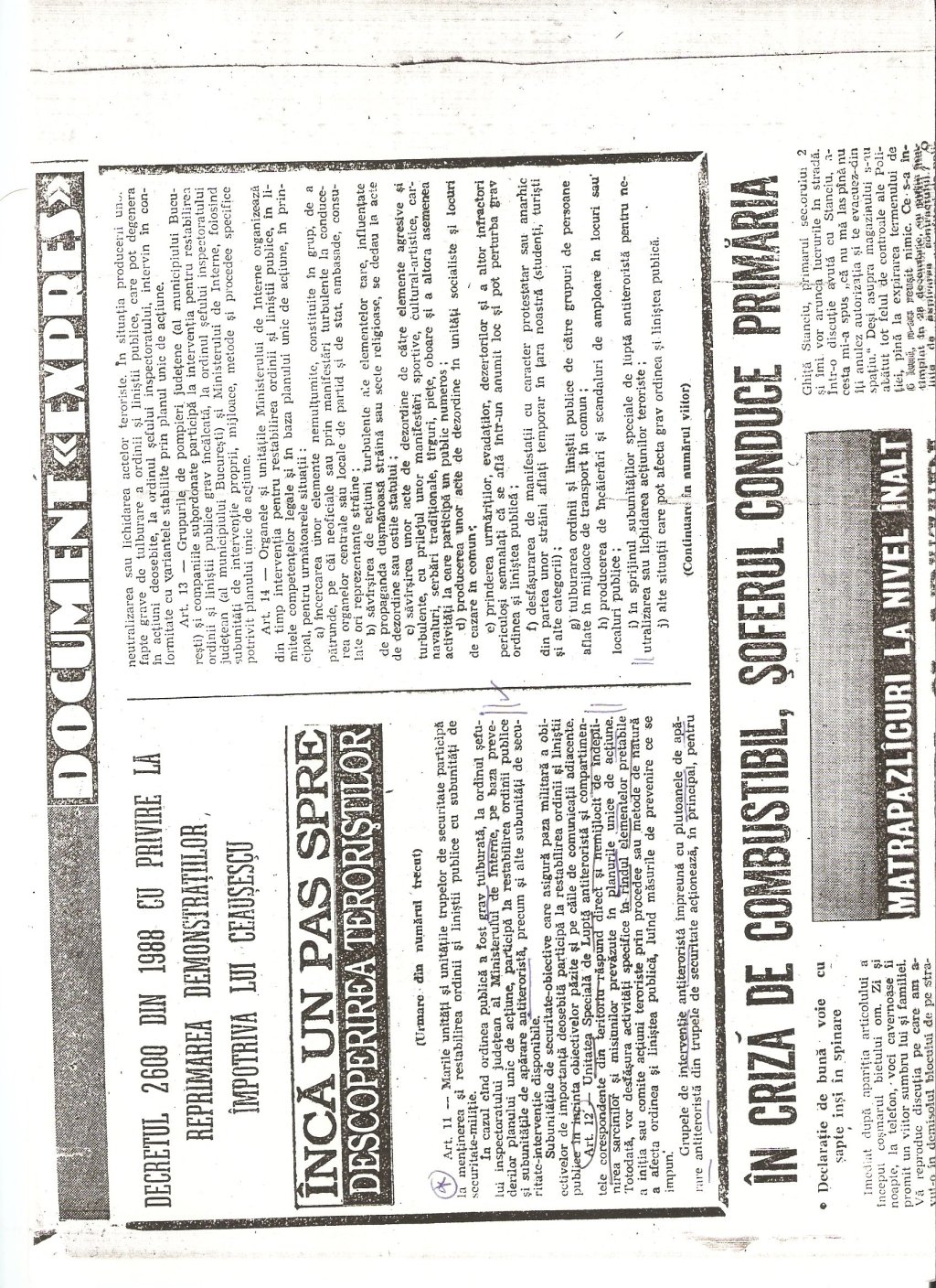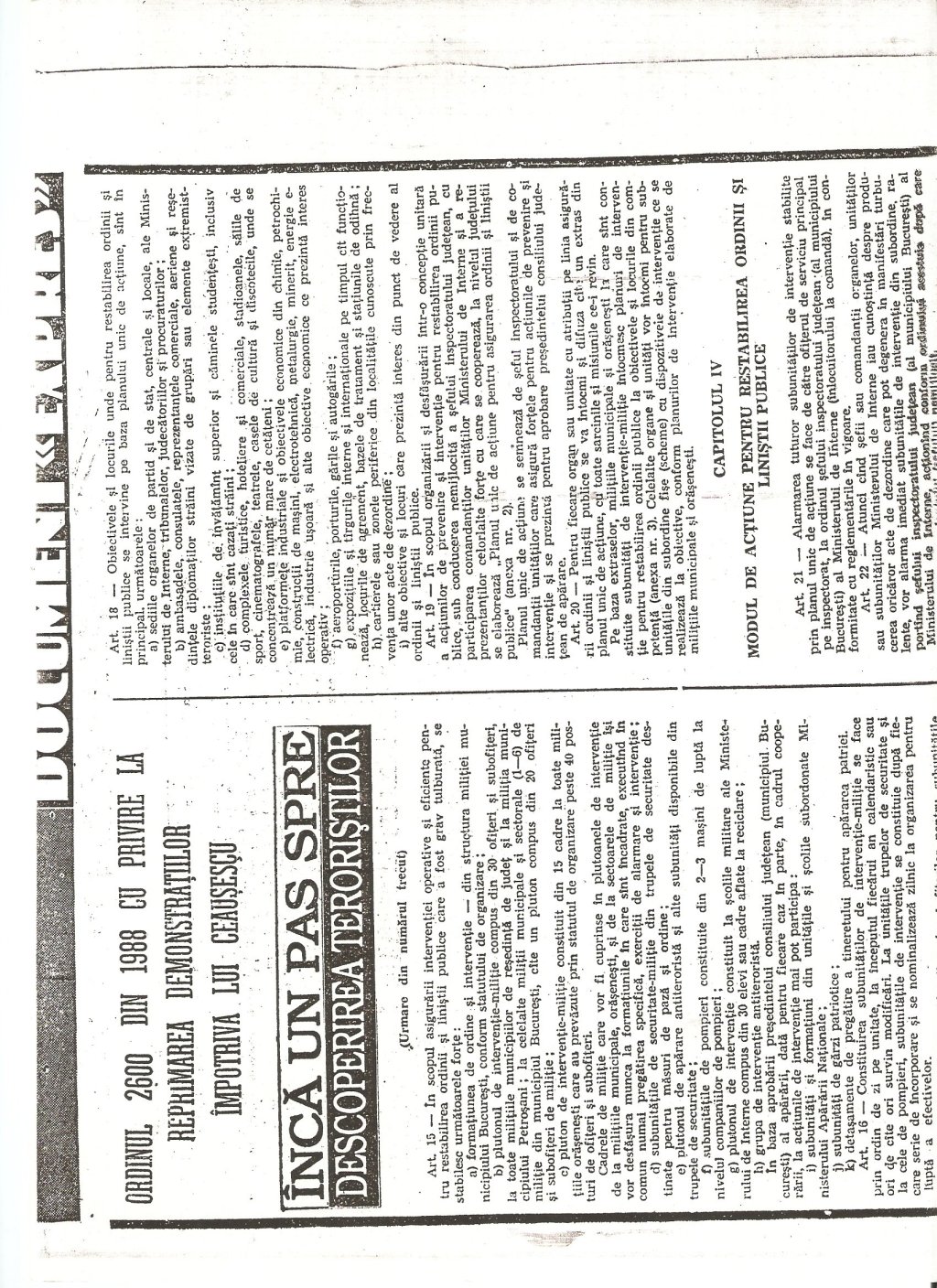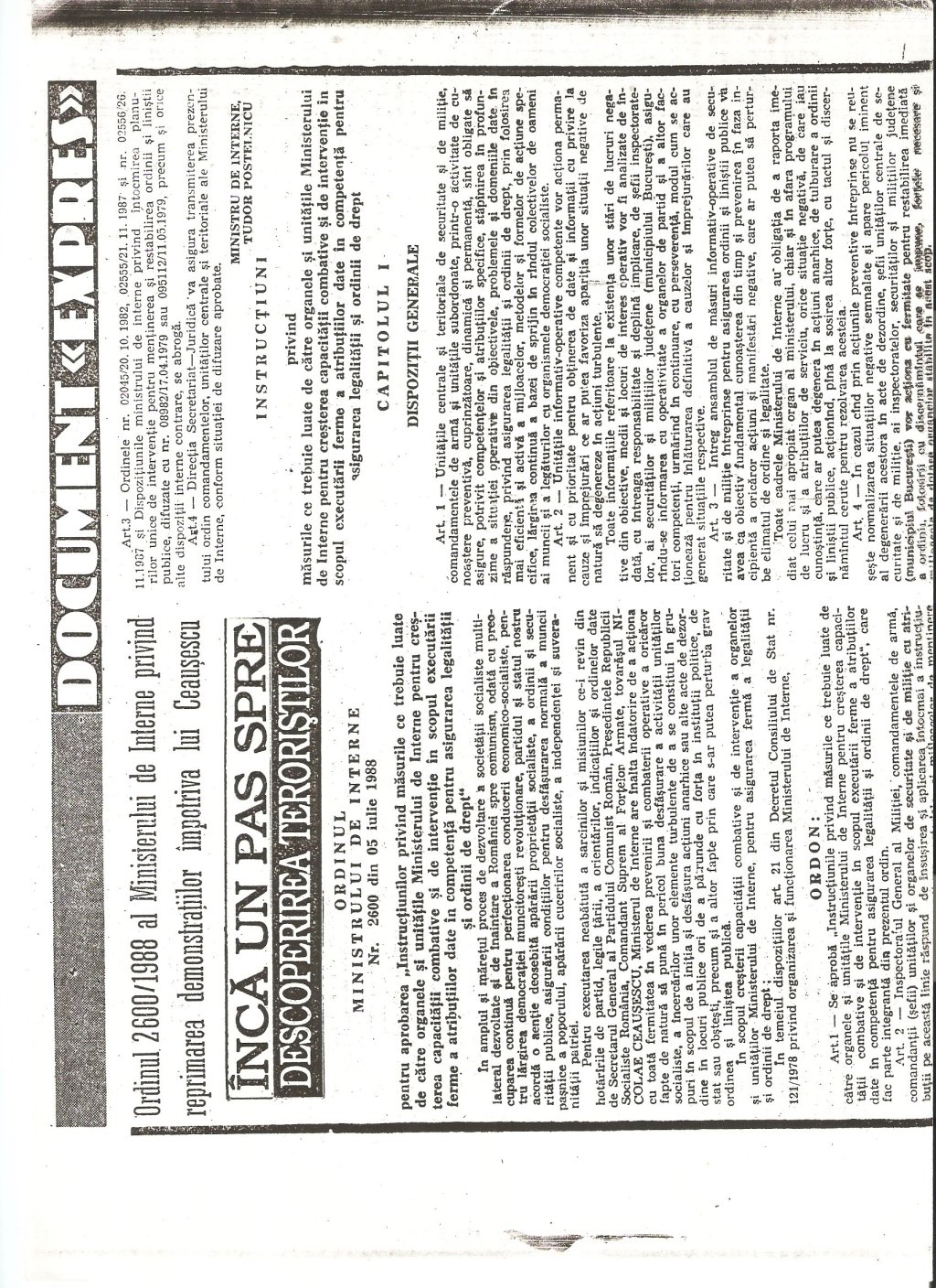 1. Orice analiză asupra comportamentului Securităţii în decembrie 1989 trebuie să pornească de la faptul că, după revolta muncitorilor de la Braşov din 15 noiembrie 1987 (curăţată de toate exagerările care au urmat), atitudinea noii conduceri a Securităţii faţă de Nicolae Ceauşescu s-a schimbat. Prin Ordinul 2600/1988, DSS s-a retras legislativ şi operativ din toate acţiunile care implicau contactul cu proteste de stradă şi manifestaţii publice de masă (stadioane), concentrându-se pe ideea de a deveni exclusiv un serviciu de culegere de informaţii. Toate atribuţiile care puteau implica un contact represiv cu mulţimea au fost date MI, în particular Miliţiei. Procesul nu era finalizat până în decembrie 1989 (de exemplu participarea Securităţii la trasee a fost redusă cu 40%), dar mişcarea s-a văzut clar la Timişoara, unde Securitatea a primit ordinul să nu iasă din sedii încă din 16 decembrie seara.