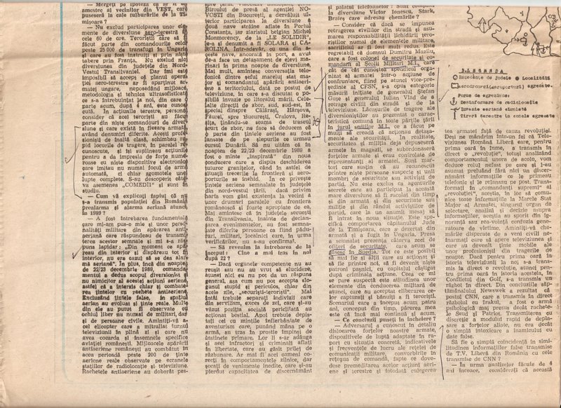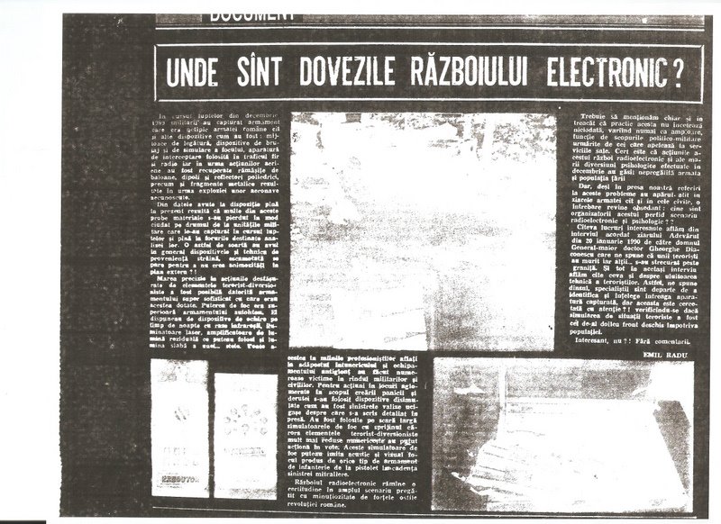 De la bun inceput, au uimit actiunile de bruiaj de radiolocatie prin imitare, procedeu electronic ultramodern, prin care inamicul preia impulsul electronic al unei statii de radiolocatie adversara, il amplifica si il multiplica, dupa care il inapoiaza statiei in causa sub multiple semnale corespunzatoare unor imagini ale unor tinte aeriene fictive. Cu o asemenea “intoxicare” se mai intilnise radiolocatia noastre inainte de 16 decembrie 1989, pe la sfirsitul lui noiembrie, cind un se reusise a se identifica autorii. Asemenea semnale au provenit din niste zone izolate din aproprierea unor dispozitive ale cercetarii apararii antiaeriene. Atunci nu s-a dat importante unor indivizi aparuti in zonele respective si care s-au dat drept pescari, vinatori, excursionisti, sau chiar militari in uniforma romaneasca. Ulterior s-a constatat ca acestia nu aveau nici o legatura cu indeletnicirile pe care le revendicasera. Fata de diversiunea din ultímele zile ale lunii decembrie, acele semnale din noiembrie au aparut ca simple incercari si nicidecum ca antrenamente pentru punerea in functiune a sistemelor electronice de bruiaj in vederea actiunilor viitoare. (Colonel (r) Gheorghe Eftimescu, 23 martie 1992, “Un ‘Joc de Razboi’ Ciudat,” Europa (Est/Vest), nr. 77 mai-iunie 1992, p. 3)