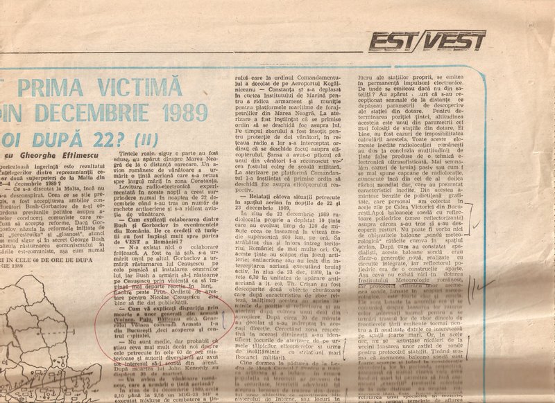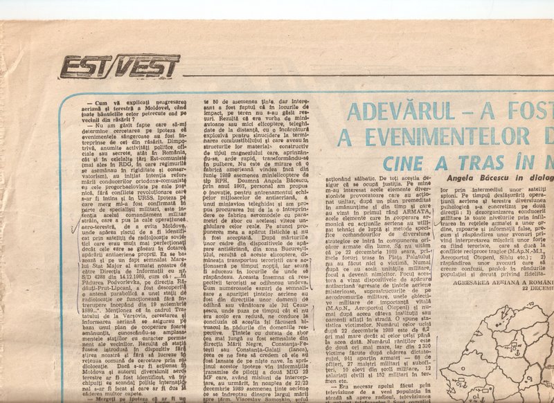Nu am gasit fapte care sa-mi determine cercetarea pe ipoteza ca evenimentele sangeroase au fost intreprinse de cei din rasarit. Dimpotriva, anumite activitati politice, oficiale, sau secrete, atat in Romania, cat si in celelalte tari Est-comuniste…Ipoteza pe care merg mi-a fost confirmata in parte de specialisti militari, este intentia acelui comandament militar strain, care a pus la cale operatiunea aero-terestra, de a evita Moldova, unde aparea riscul de a fi identificat prin satelitii de radiolocatie sovietici care erau mult mai perfectionati decat cele care se gaseau in dotarea aparatii antiaeriene proprii. Ea se bazeaza si pe un fapt semnalat Marelui Stat Major al armatei noastre de catre Directia de Informatii cu nr. S/D 4288 din 14.12.1989, cum ca: “…in Padurea Podvorlevka, pe directia Radauti-Prut-Lipcani, a fost descoperit o antena parabólica a unei statii de radiolocatie ce functioneaza far intrerupere incepand din 19 noiembrie 1989…”…Daca s-ar fi actionat in Moldova si autorul diversiunii aeroterrestre ar fi fost identificat, va inchipuiti ce scandal politic international s-ar fi iscat si care ar fi dus la caderea multor capete.