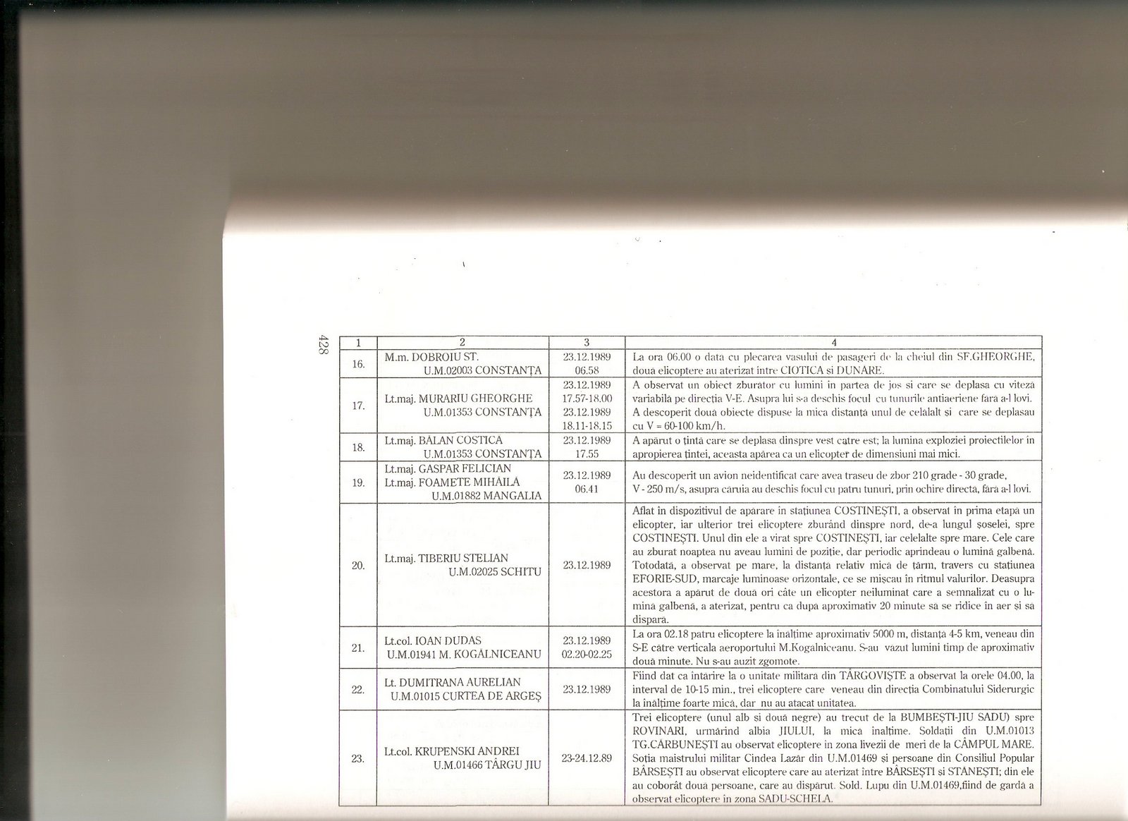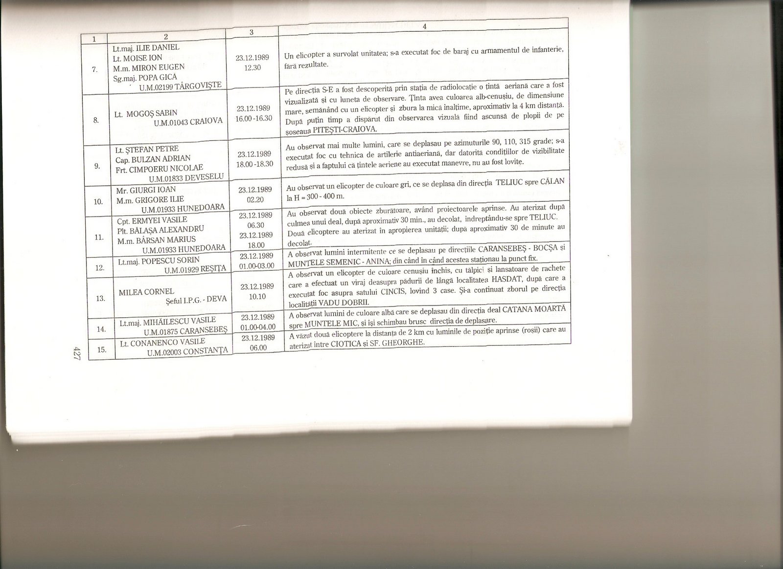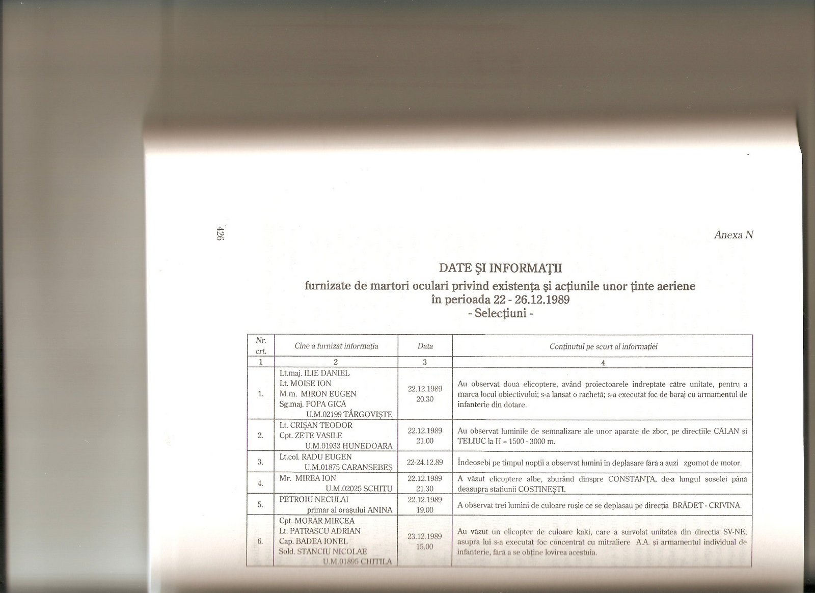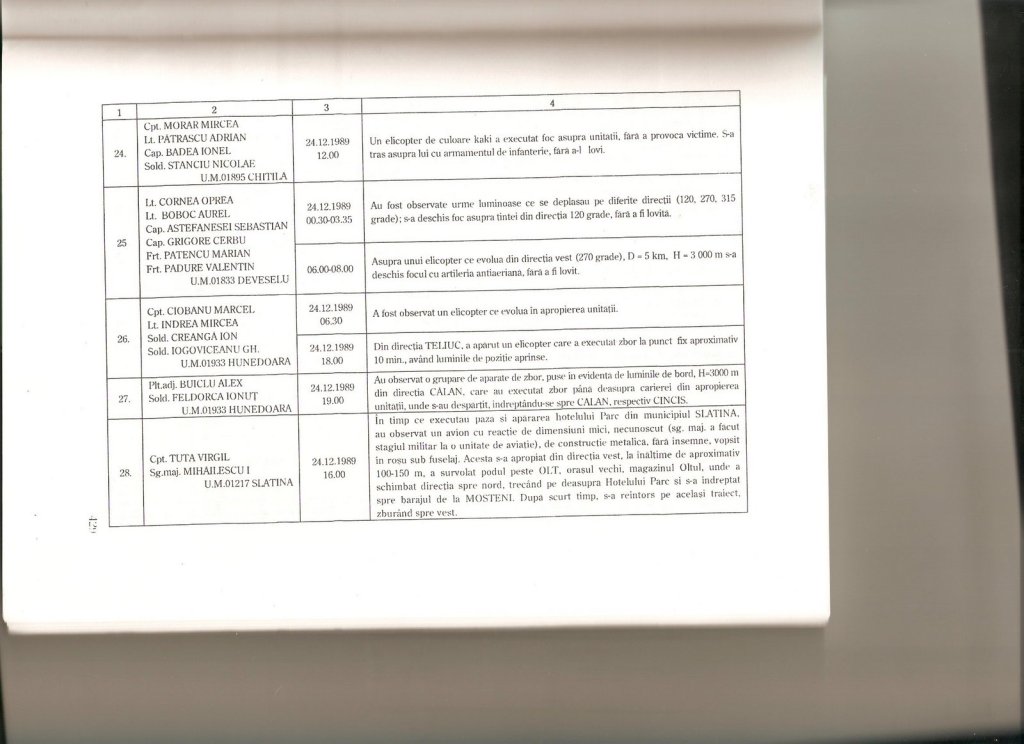…Dupa marturiile unor cadre din dispozitivele de aparare antiaeriana, din zona Bucurestiului, resulta ca aceste elicoptere, dimineata transportau teroristii care actionasera pe timpul noptii, iar seara ii aduceau in locurile de unde se raspandeau. Aceasta insemna ca respectivii teroristi se odihneau undeva. Cum numeroasele cazuri de semnalizare a aparitiei tintelor aeriene au fost din directiile unor domenii de odia sau vanatoare ale lui Ceausescu, unde paza pe timpul cat el un era acolo era redusa, ne conduce la concluzia ca acestia isi facusera bivuacul in padurile din domeniile respective….Mai amintesc ca in judetele secuiesti din Transilvania, inainte de declansarea evenimentelor, au fost semnalate diferite persoane ca fiind padurari, militari, localnici care, in urma verificarilor, nu s-au confirmat.
