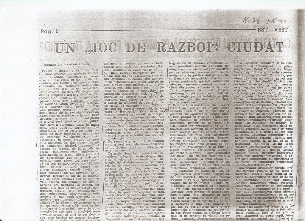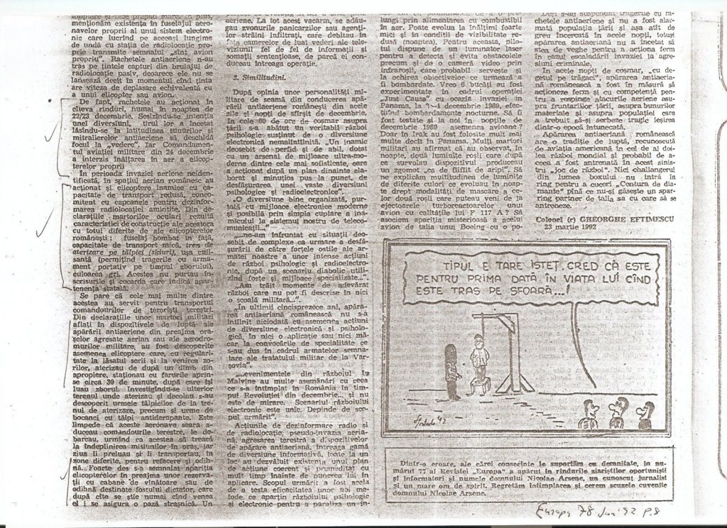 Colonel (r) Gheorghe Eftimescu, 23 martie 1992, “Un ‘Joc de Razboi’ Ciudat,” Europa (Est/Vest), nr. 78 iunie 1992, 8.